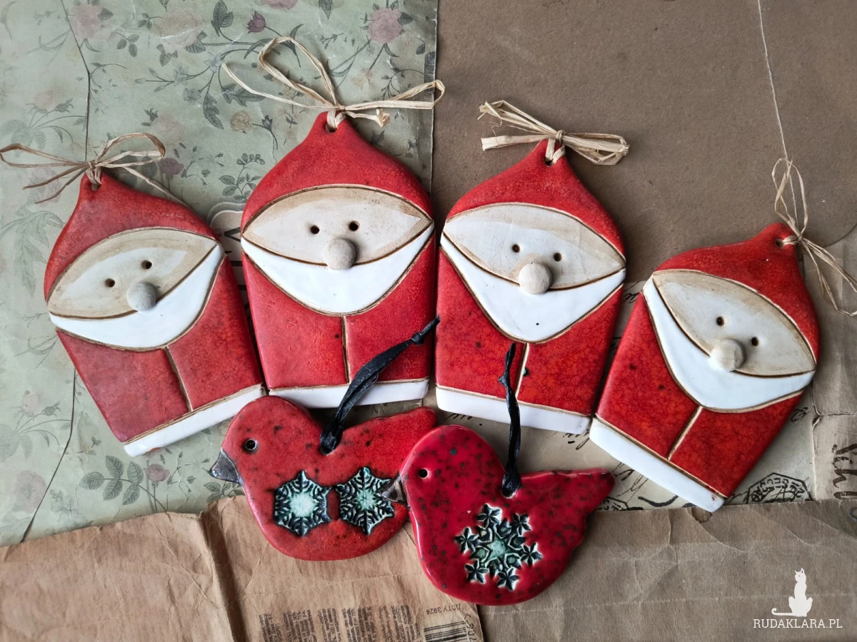 Zestaw świąteczny złożony z 4 ceramicznych Mikołajów wys. ok 10 cm oraz 2 ptaszków o wymiarach ok 4,5 cm x 7 cm. Serdecznie polecam.