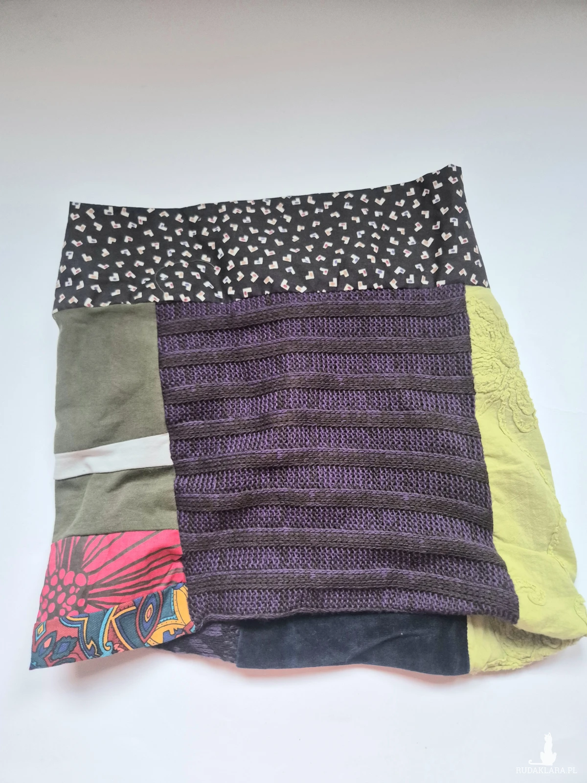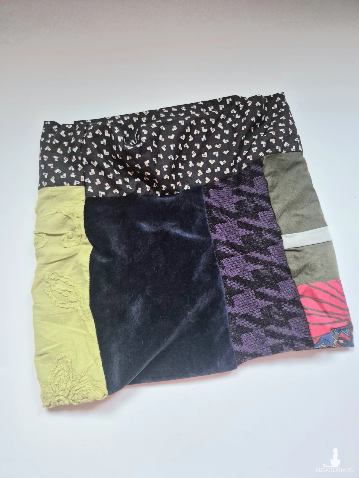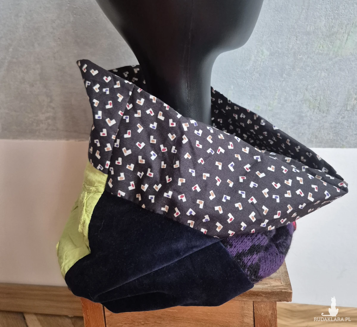 komin uszyty z z różnych tkanin rozmiar 33 x 43 cm można go naciągnąć na głowę polecam wykonany w pojedynczym egzemplarzu rękodzieło