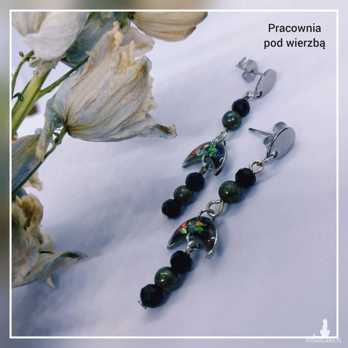 Księżyce ręcznie malowane barwioną żywicą jubilerską, podrasowane brokatem.