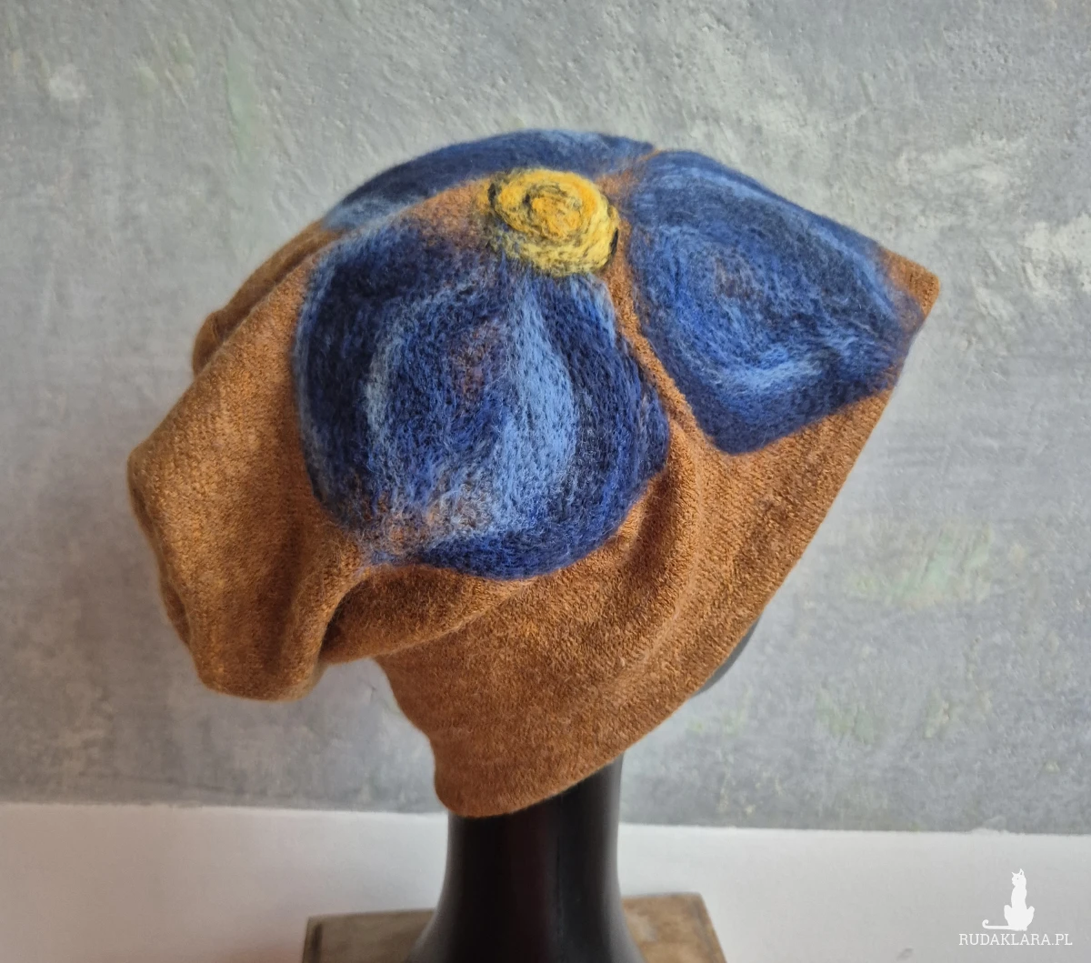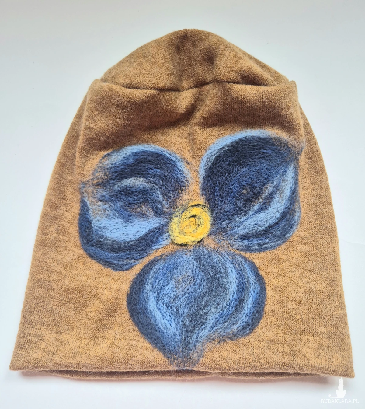 czapka wełniana filcowana zimowa miodowa handmade w kwiaty na podszewce-- rozmiar uniwersalny, wełniana, filcowana wełną merynosów, bardzo ciepła, fantastyczna, miła, miękko układa się na głowie, niesamowicie zwraca uwagę, doskonałą na codzienne noszenie jak i na prezent, zawsze możesz ją założyć po basenie i przeżyjesz,box 44