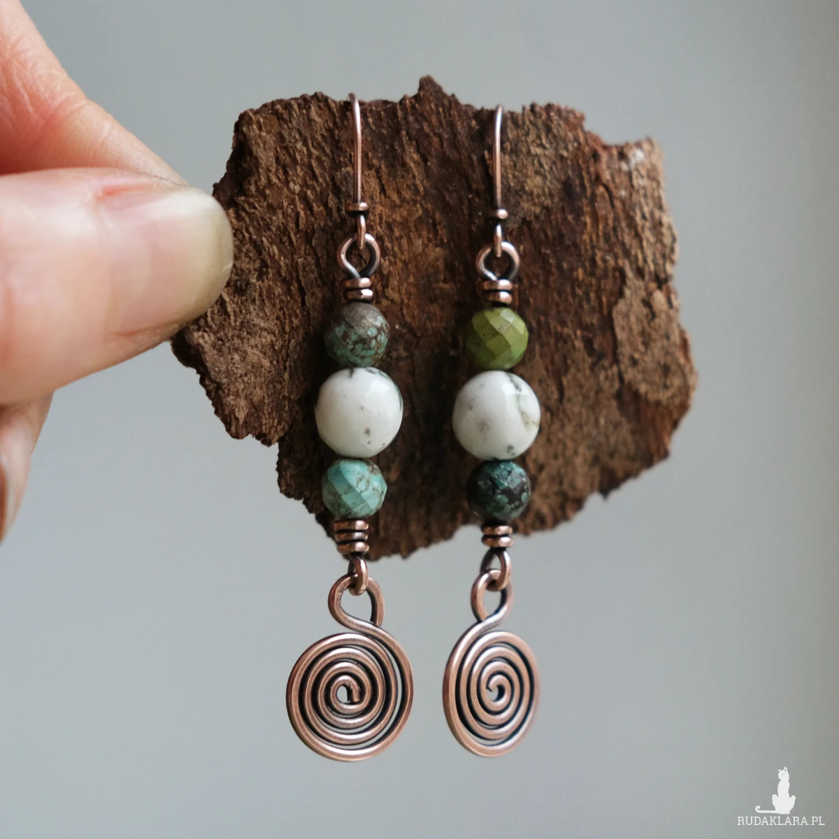 Miedziane etniczne kolczyki z kamieniami naturalnego turkusu i agatu mszystego. Prosta forma z uroczym wirkiem/spiralą, która idealnie sprawdzi się na co dzień. Kolczyki są lekkie jak piórko, waga każdego z nich to 3 gramy.