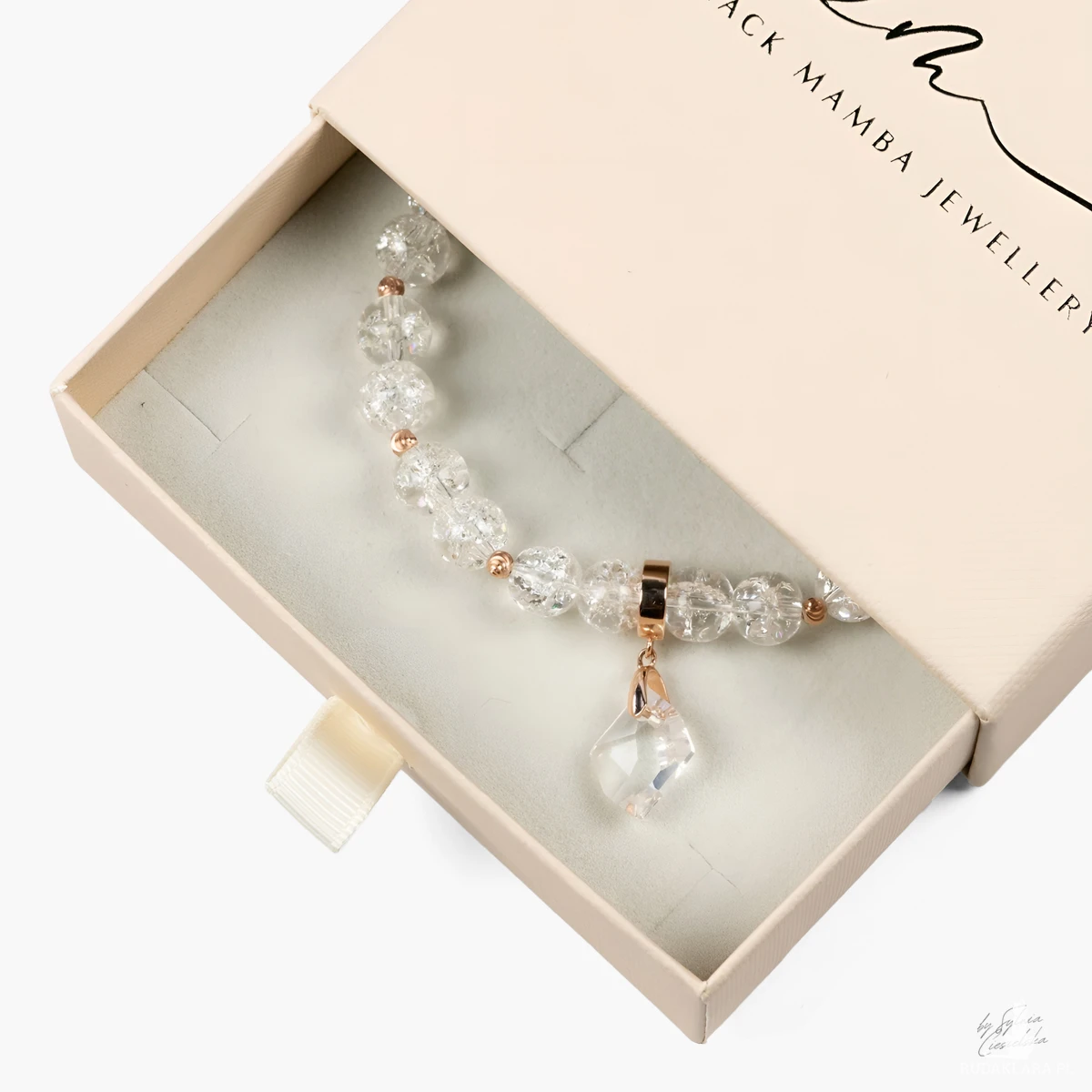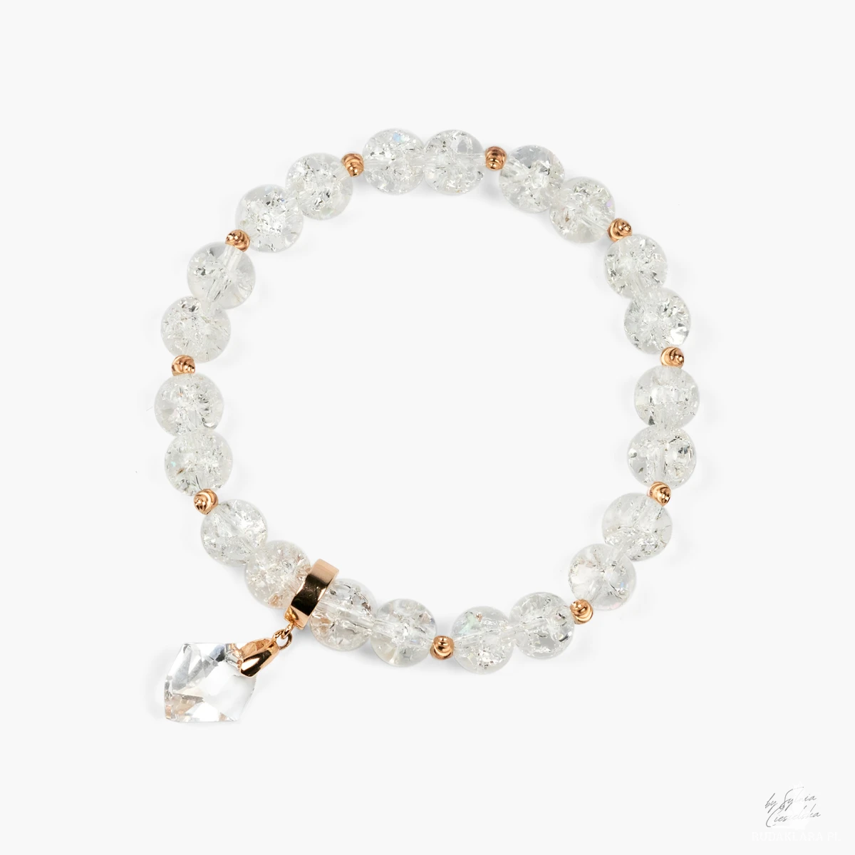Centralnym punktem bransoletki jest efektowna przywieszka Swarovski Cosmic Crystal o średnicy 14 mm, która zachwyca wielowymiarowym szlifem i spektakularnym odbiciem światła. Ten unikatowy kryształ dodaje biżuterii nowoczesnego charakteru i luksusowego wykończenia. W połączeniu z naturalnym kwarcem lodowym tworzy harmonijną kompozycję natury i precyzyjnego rzemiosła jubilerskiego. Przywieszka subtelnie porusza się przy każdym ruchu dłoni, przyciągając spojrzenia i nadając bransoletce wyjątkowej lekkości oraz elegancji.