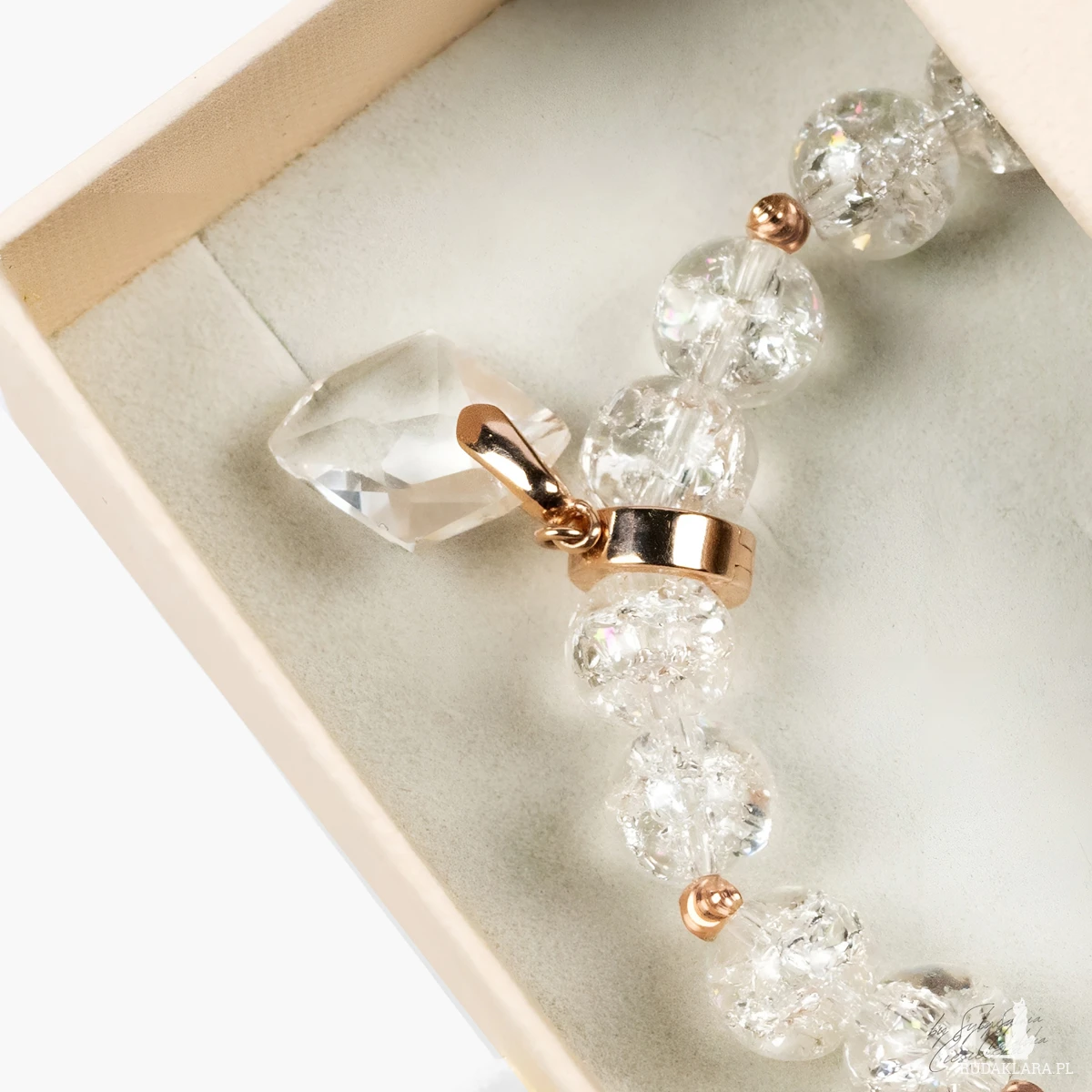Delikatne dodatki z pozłacanego srebra próby AG925 podkreślają luksusowy charakter bransoletki, nadając jej ponadczasowej elegancji. Ciepły odcień złota doskonale kontrastuje z chłodną przejrzystością kwarcu lodowego, tworząc harmonijną i wyrafinowaną kompozycję. To biżuteria, która sprawdzi się zarówno na co dzień, jak i przy wyjątkowych okazjach, subtelnie dopełniając każdą stylizację.