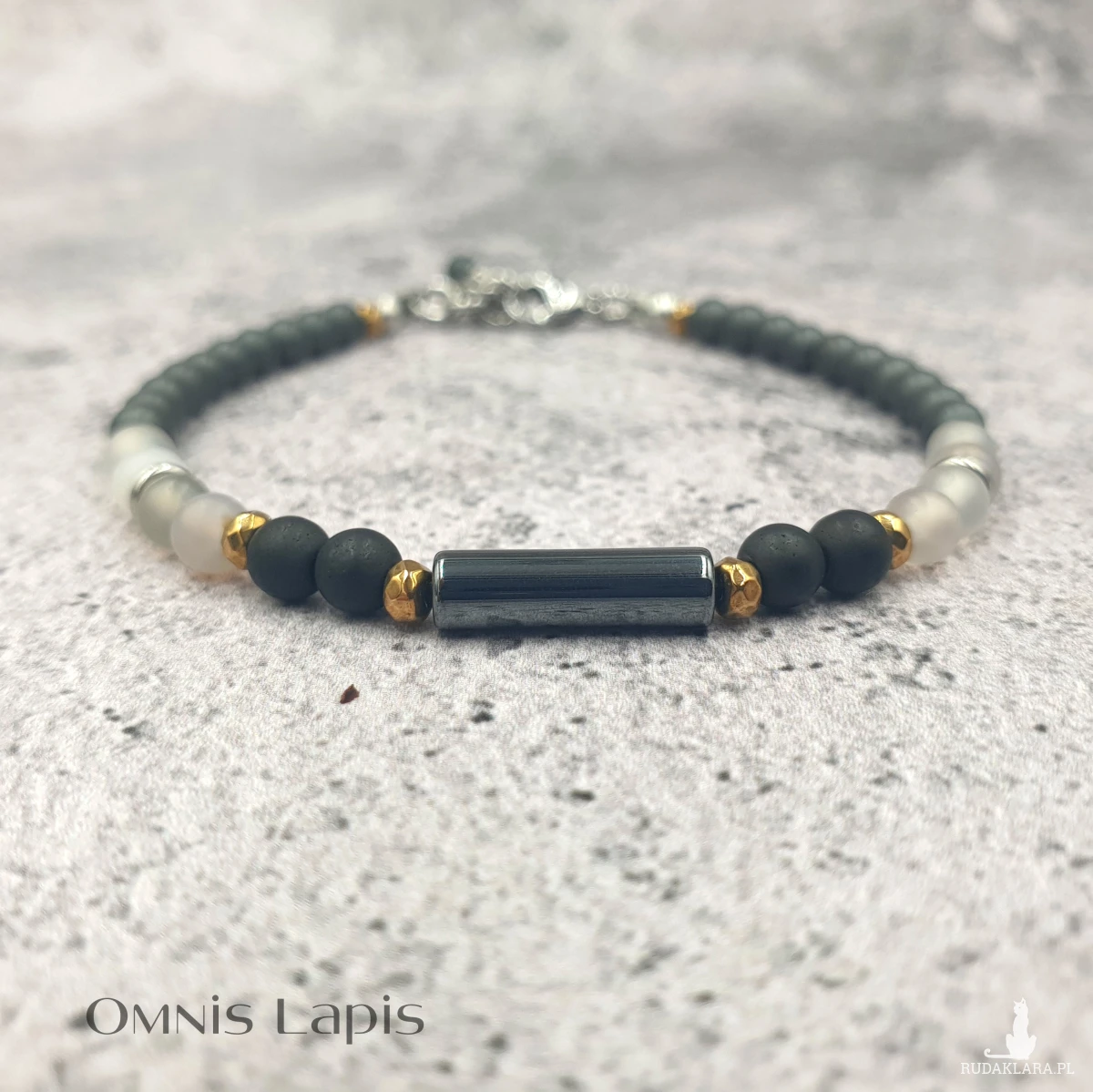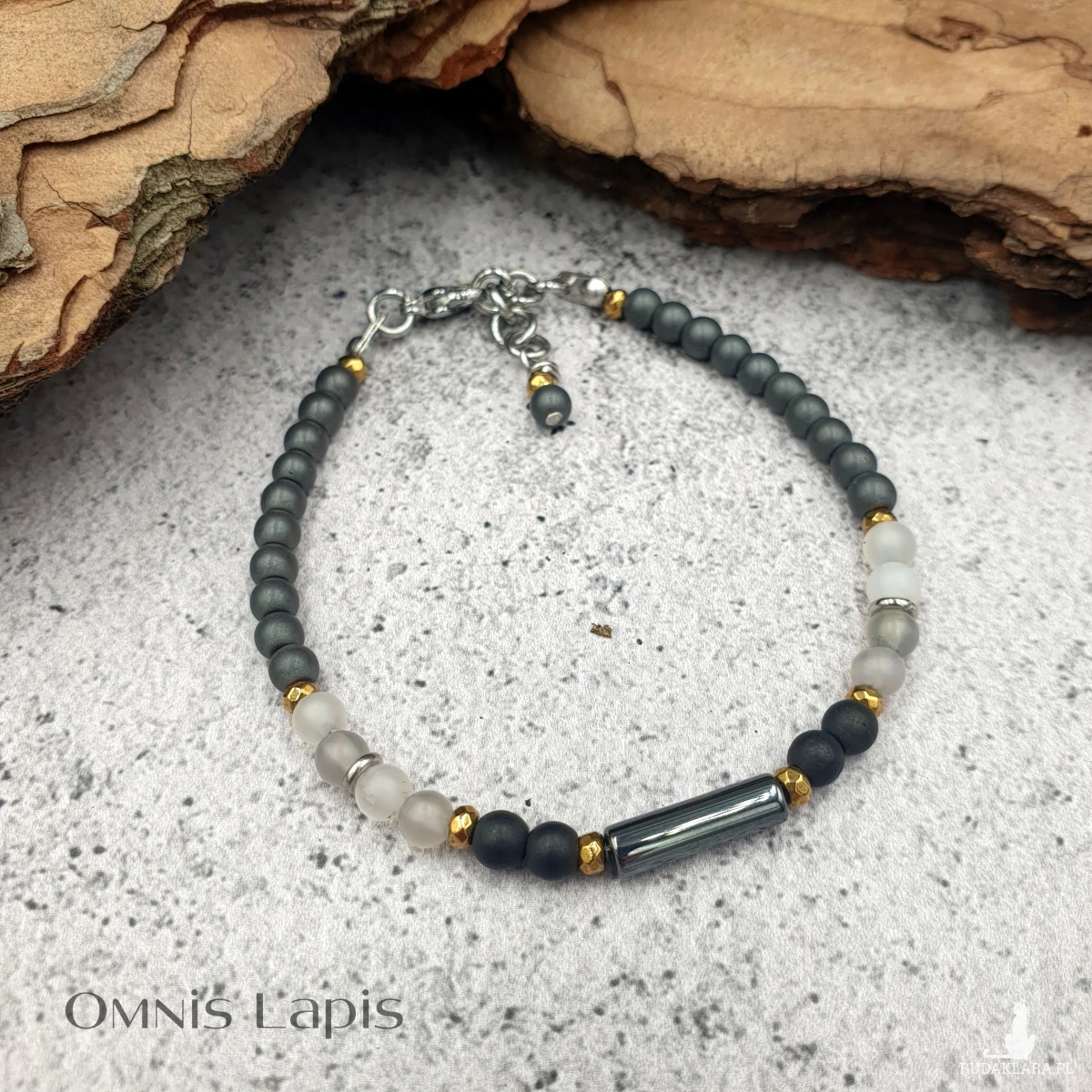 Wykonana z kul czarnego, szarego i złotego hematytu oraz szarego agatu.