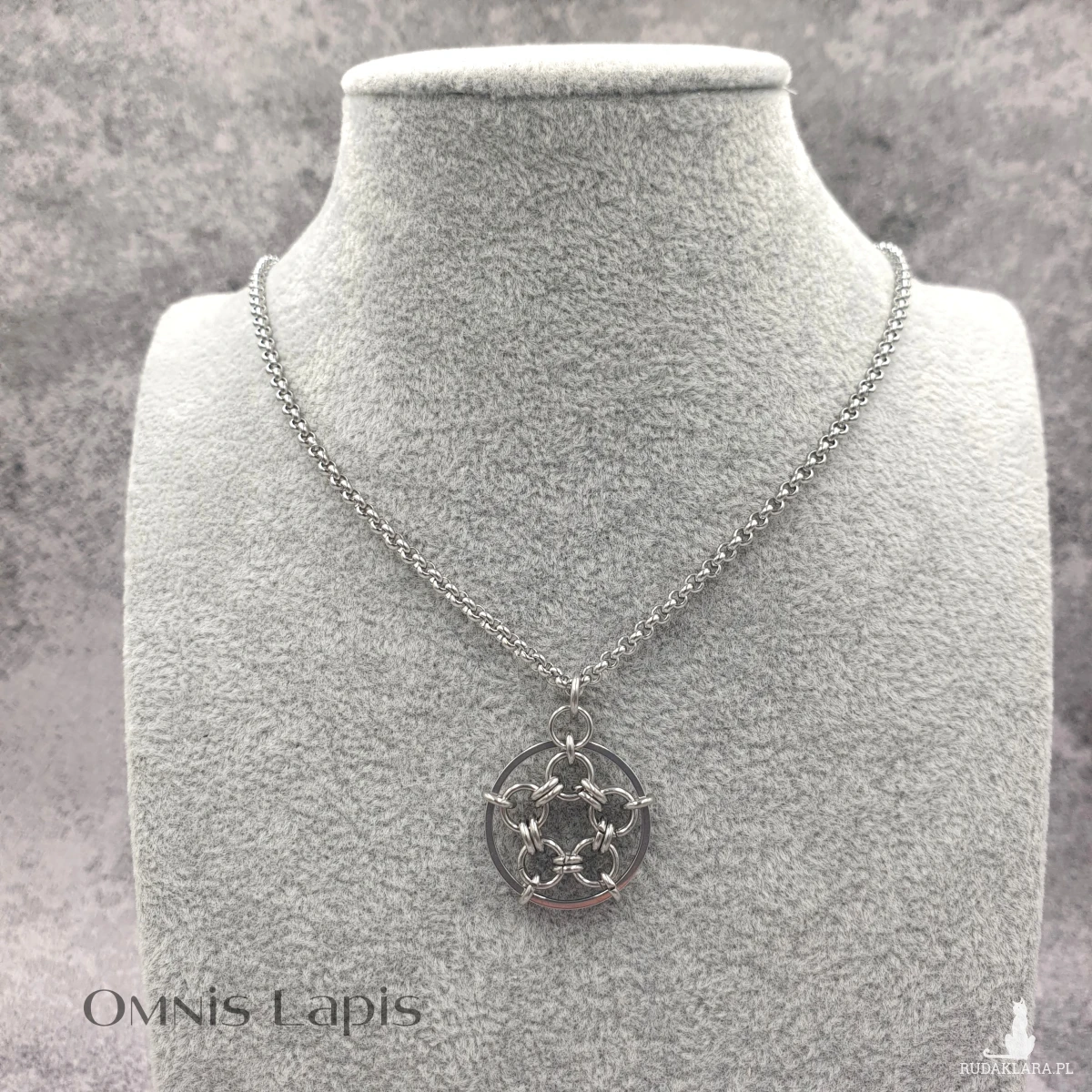 Wisiorek wykonany ręcznie w technice chainmaille, polegającej na łączeniu ogniw w określony splot.