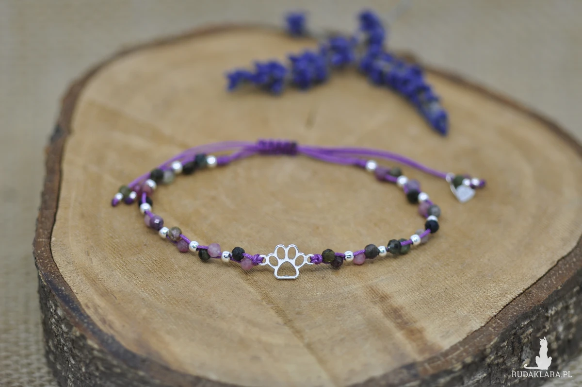 Bransoletka z kamieni naturalnych i srebra próby 925, całość jest na sznureczku nylonowym w kolorze fioletowym