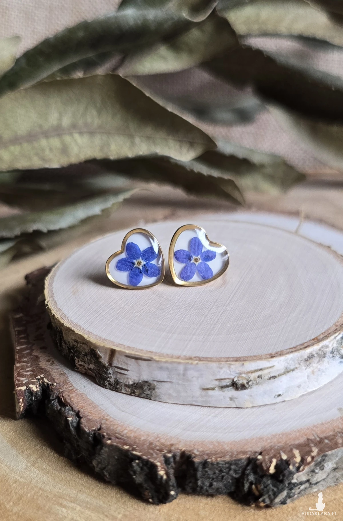 Złote kolczyki z kwiatami wkręty sztyfty z żywicy żywica epoksydowa z suszonymi prawdziwymi kwiatami niezapominajki serca serduszka