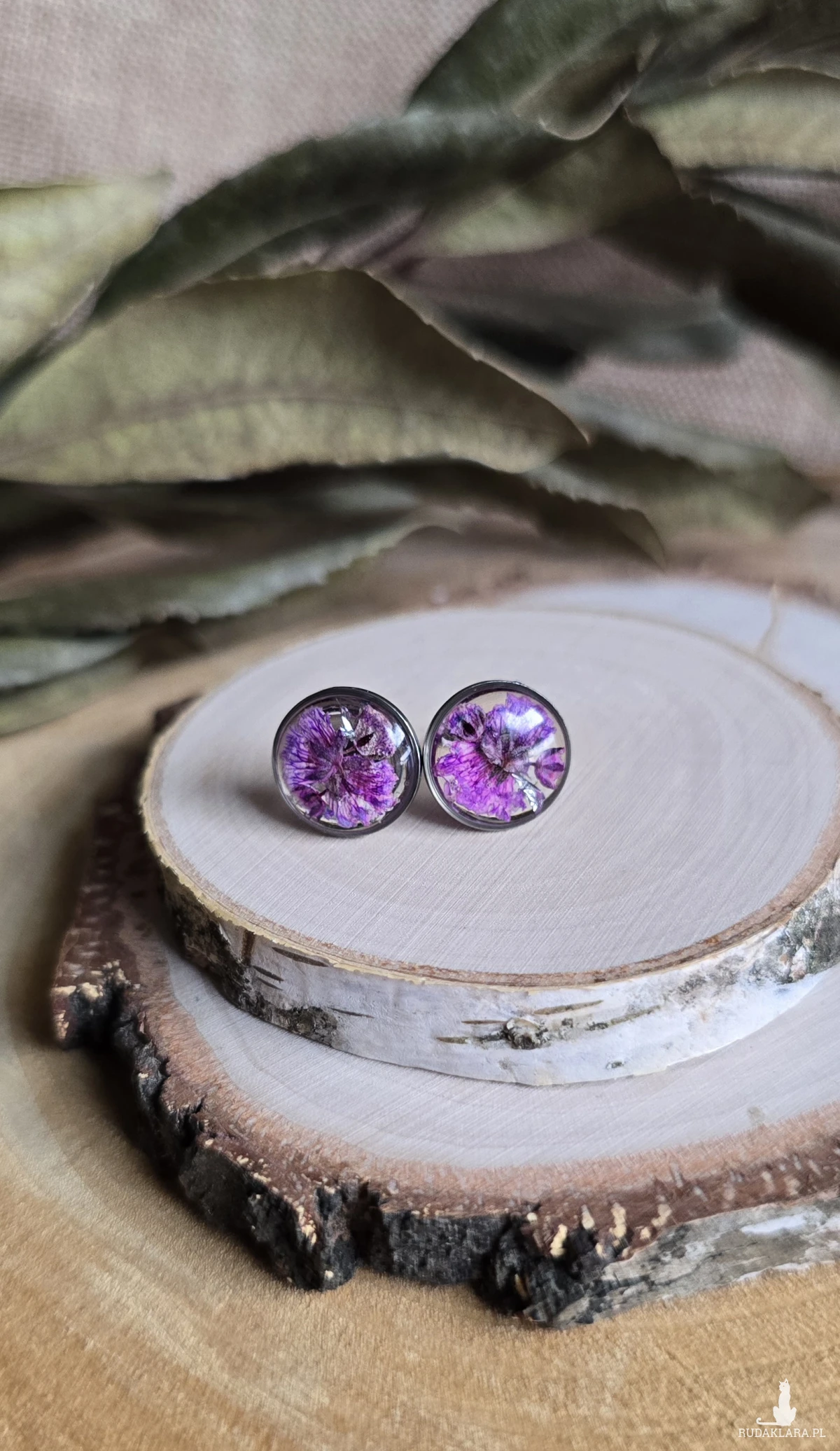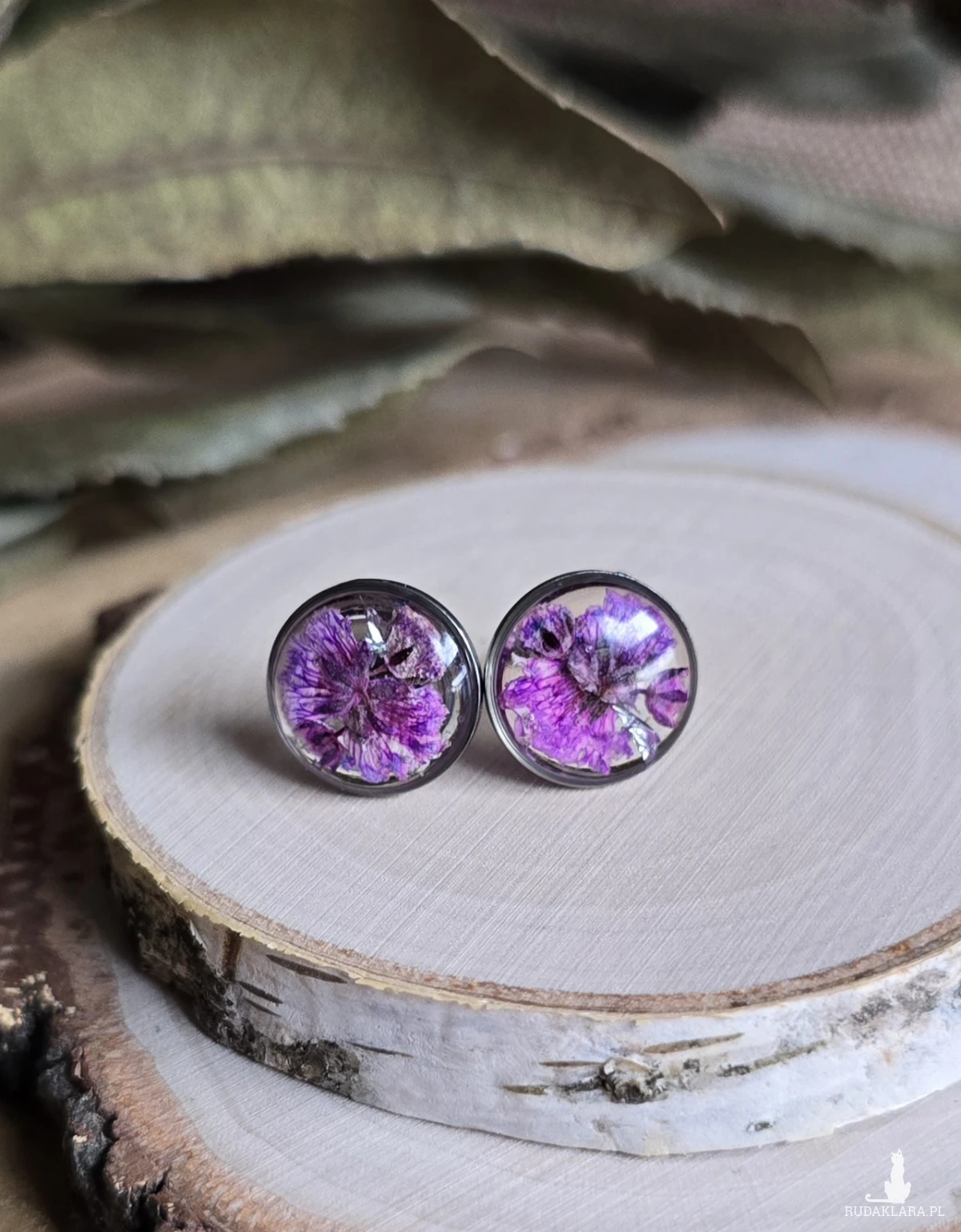 Srebrne kolczyki z kwiatami wkręty sztyfty z żywicy żywica epoksydowa z suszonymi prawdziwymi kwiatami fioletowe