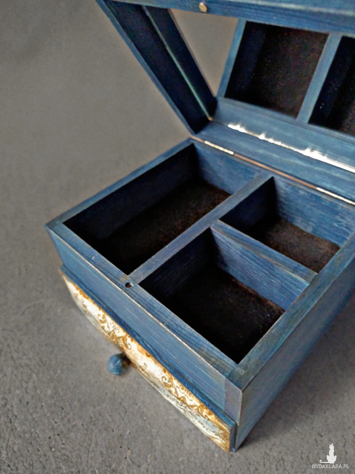 Drewniana skrzyneczka na biżuterię, z przegródkami, dodatkową szufladką i lusterkiem.
