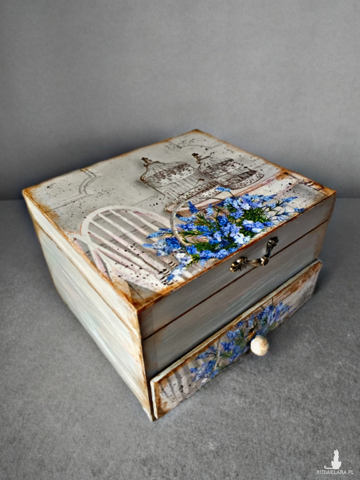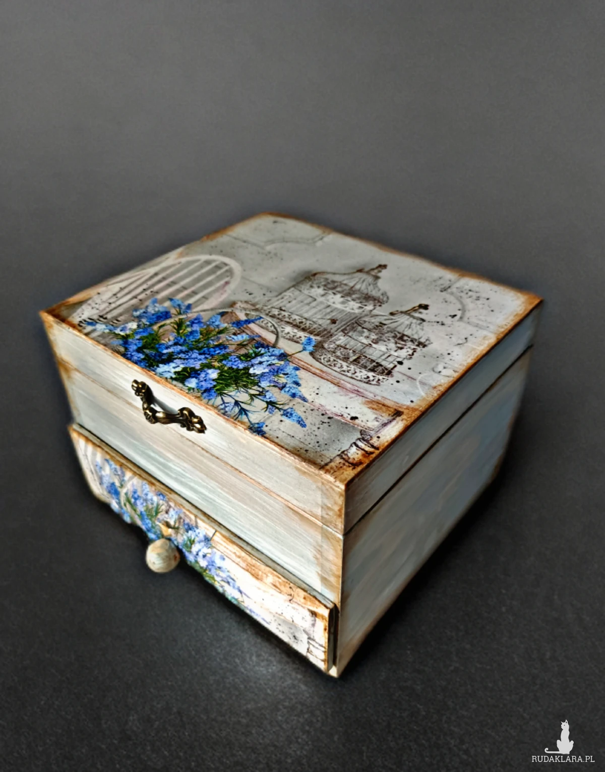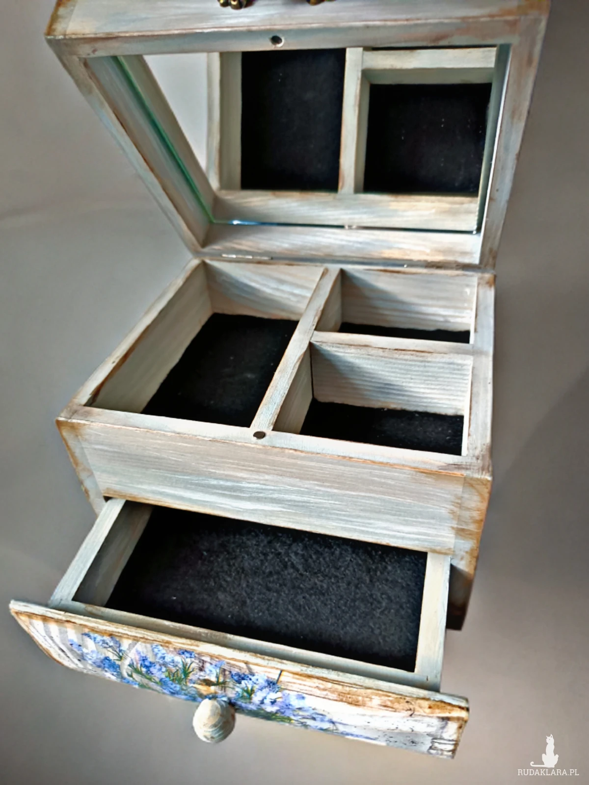 Drewniana skrzyneczka na biżuterię, z przegródkami, dodatkową szufladką i lusterkiem.