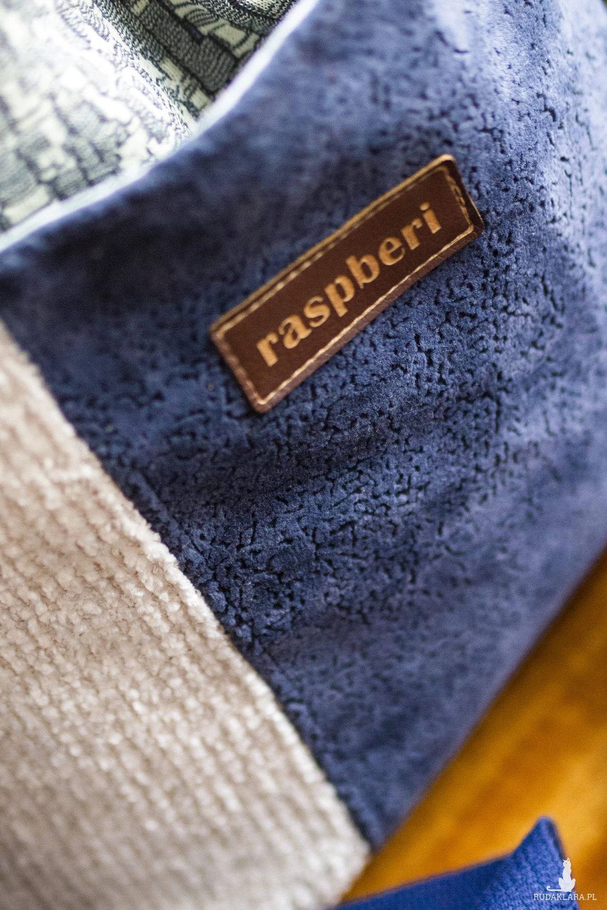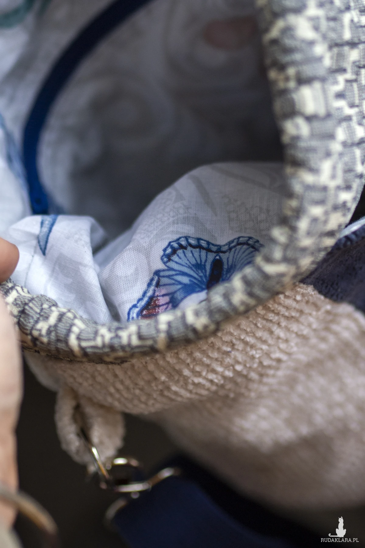 Wykonana z wzorzystej tkaniny. Z przodu oraz z na tyle torebki kieszenie (np. na telefon czy chusteczki) z granatowego tłoczonego weluru oraz tkaniny typu baranek. W środku kieszonka zapinana na suwak.