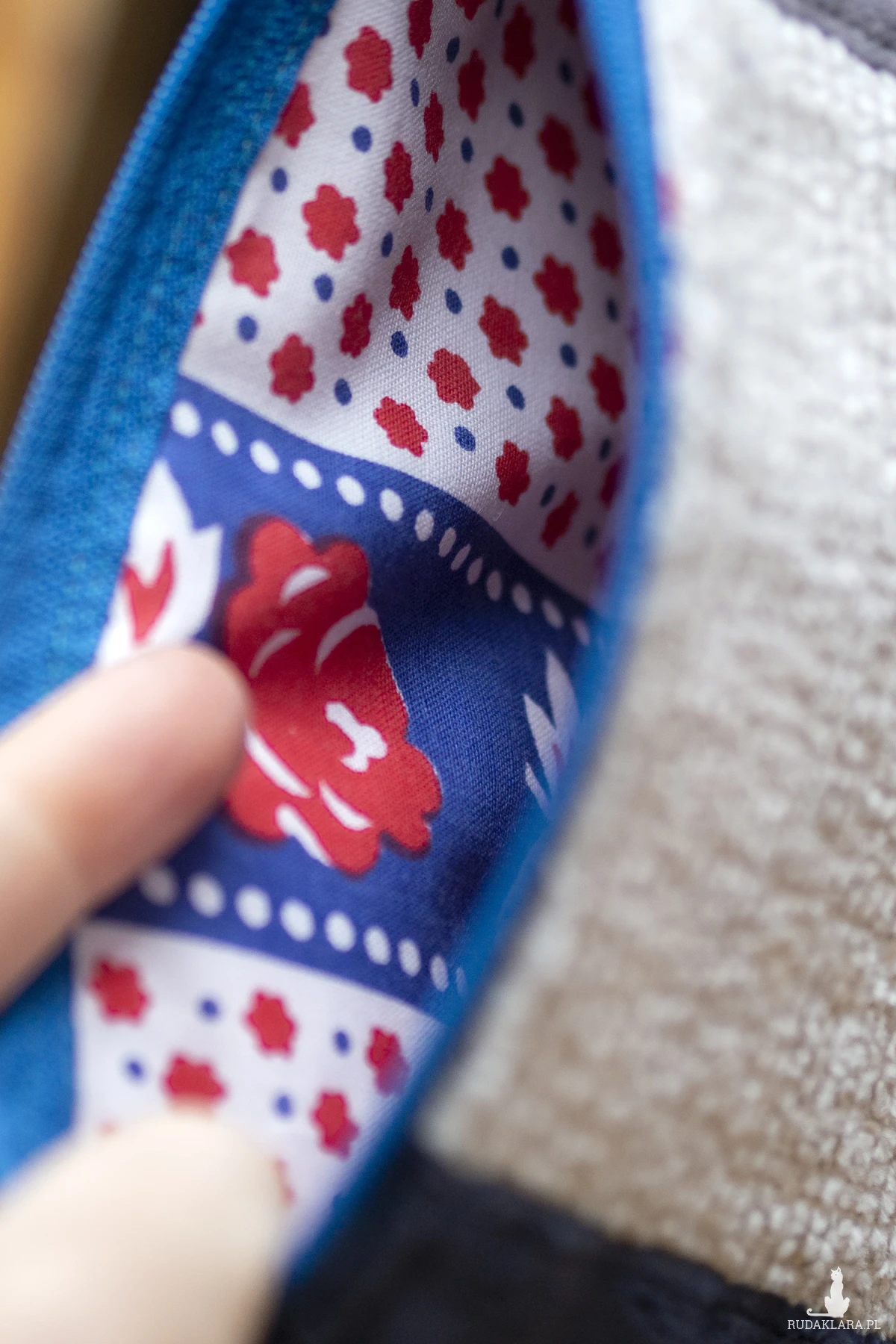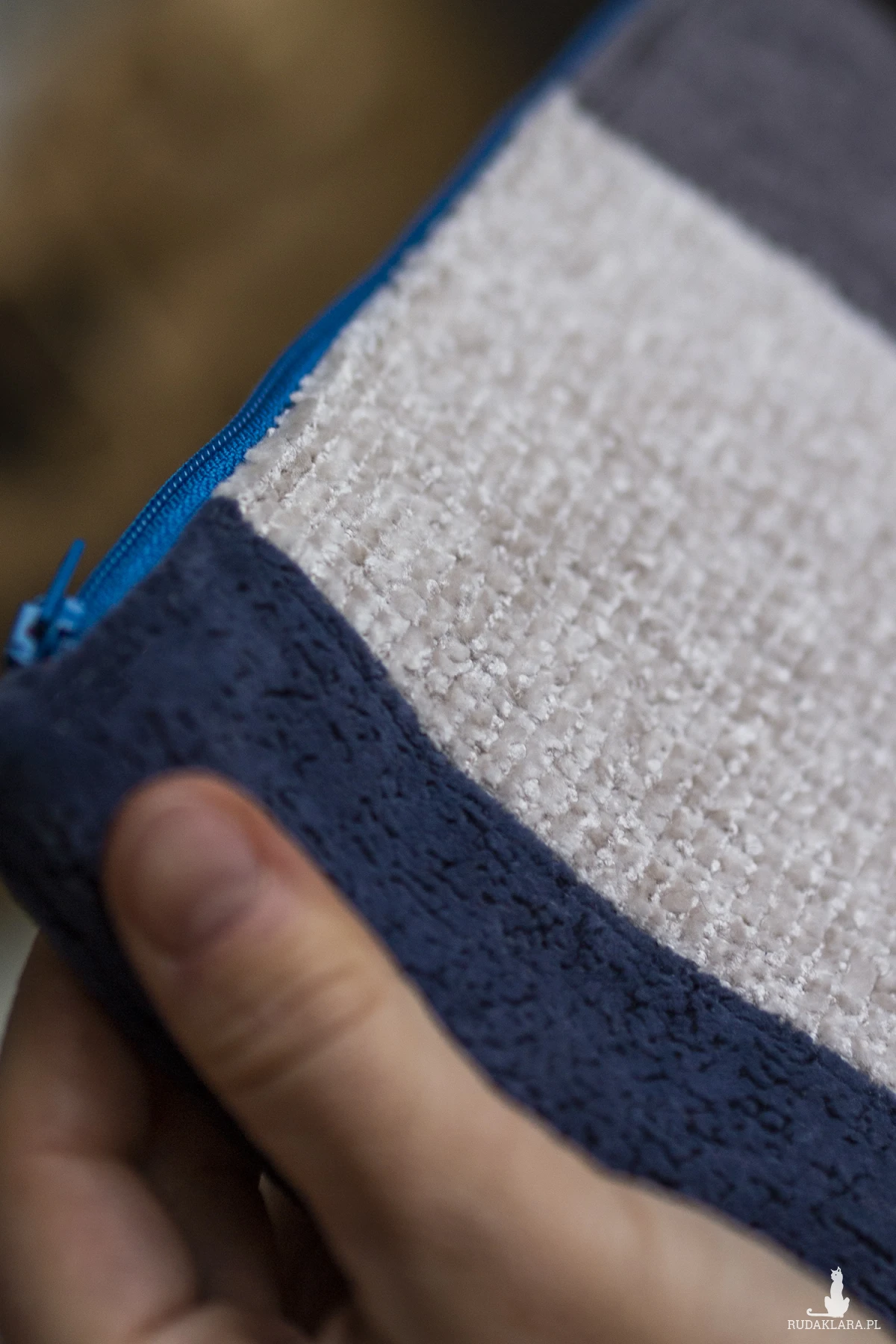 Kosmetyczka jest zapinana na suwak, w środku bawełniana podszewka.