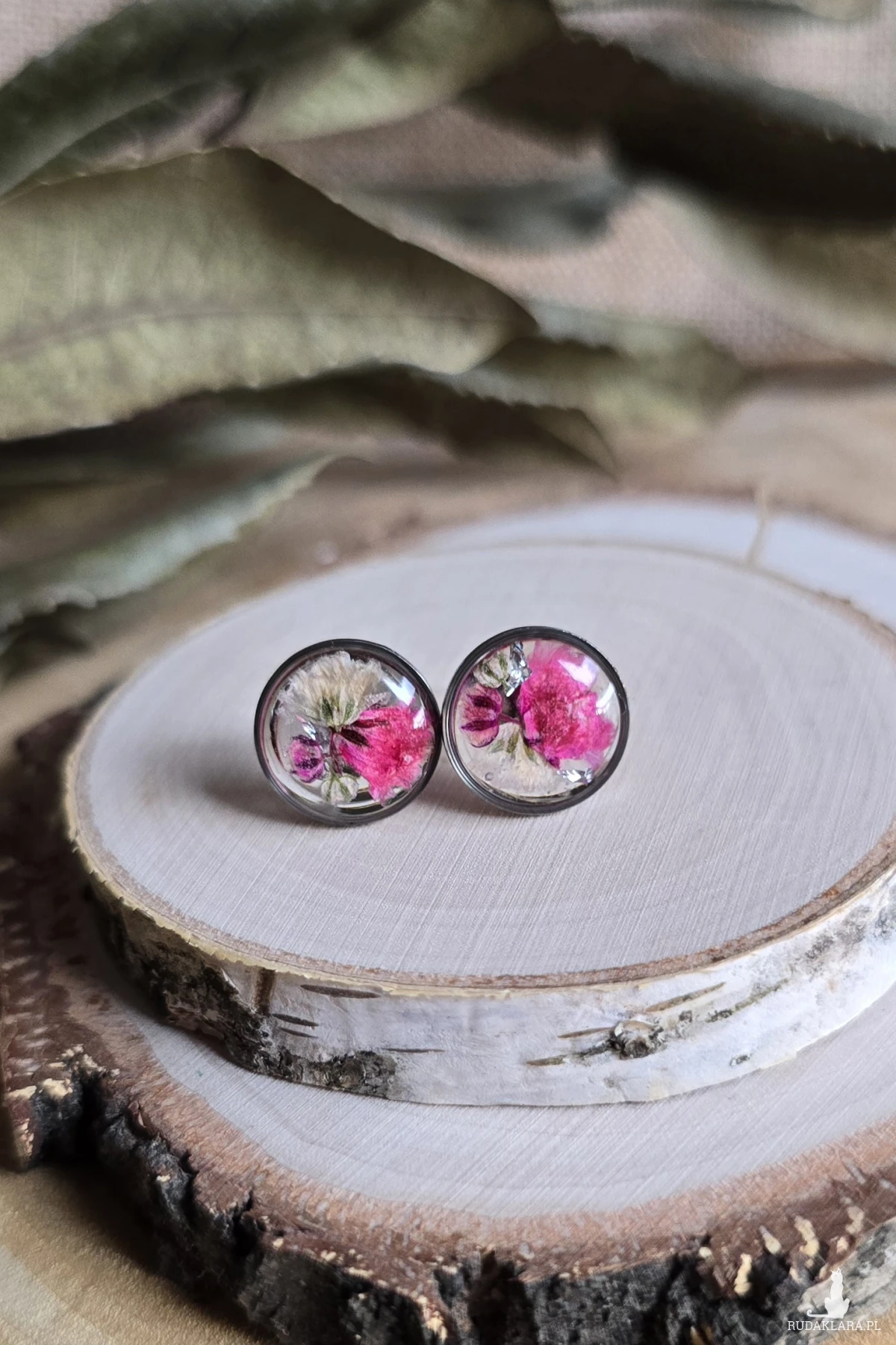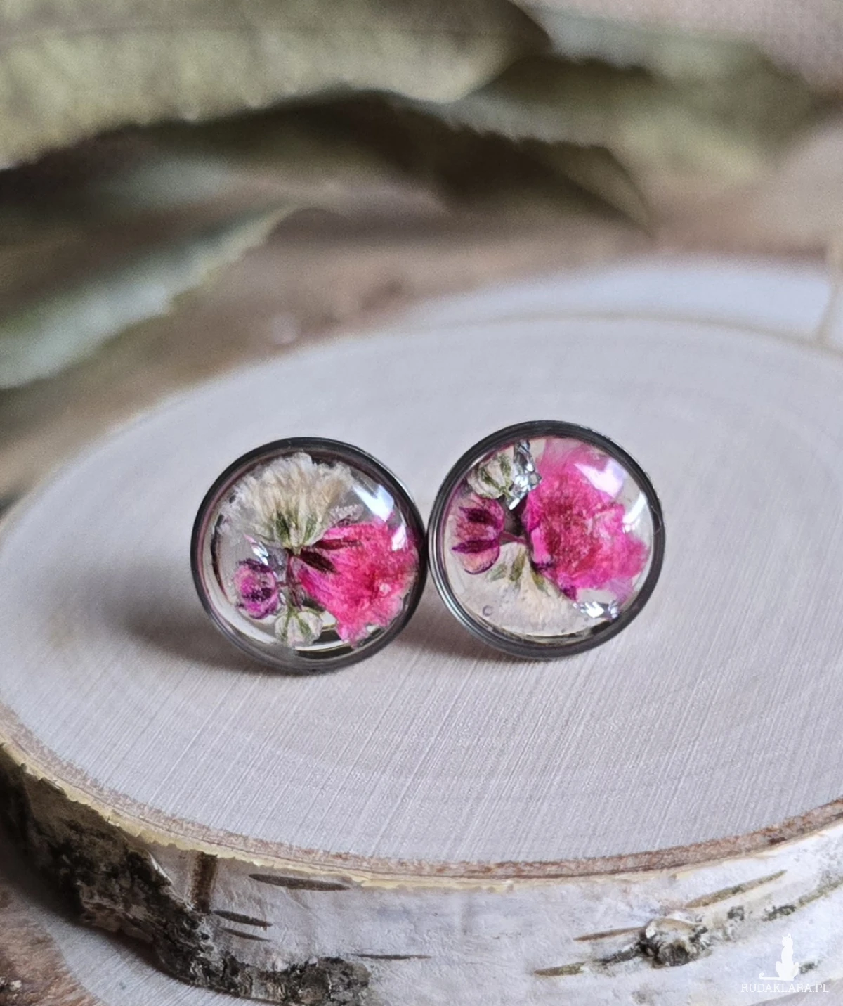 Srebrne kolczyki z kwiatami wkręty sztyfty z żywicy żywica epoksydowa z suszonymi prawdziwymi kwiatami różowe