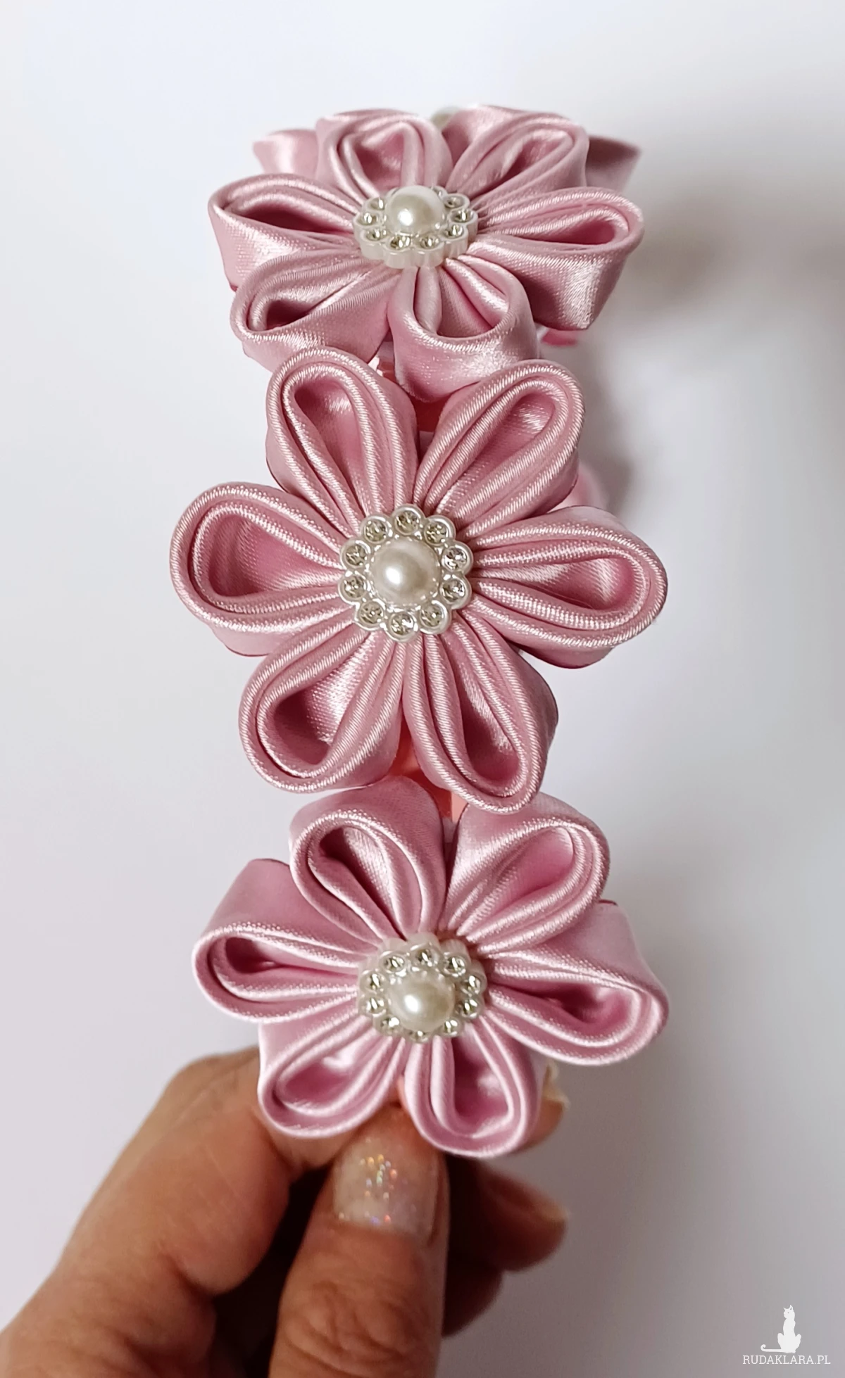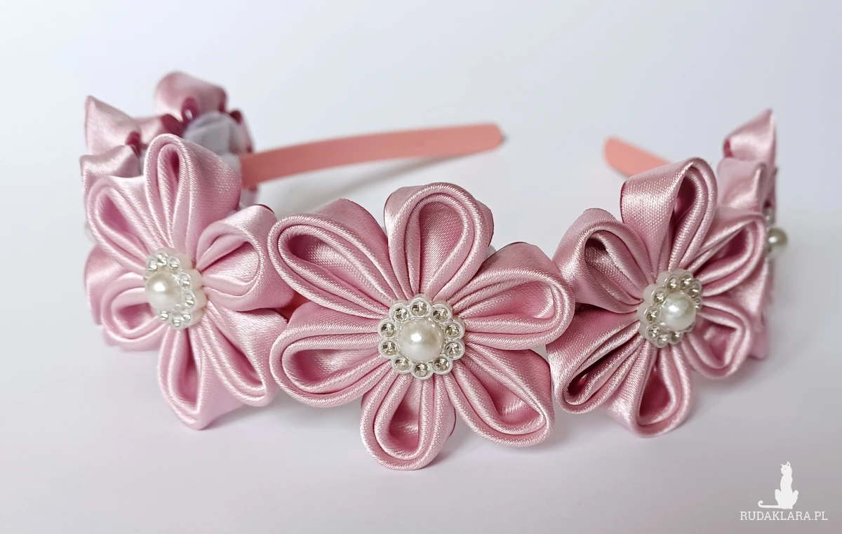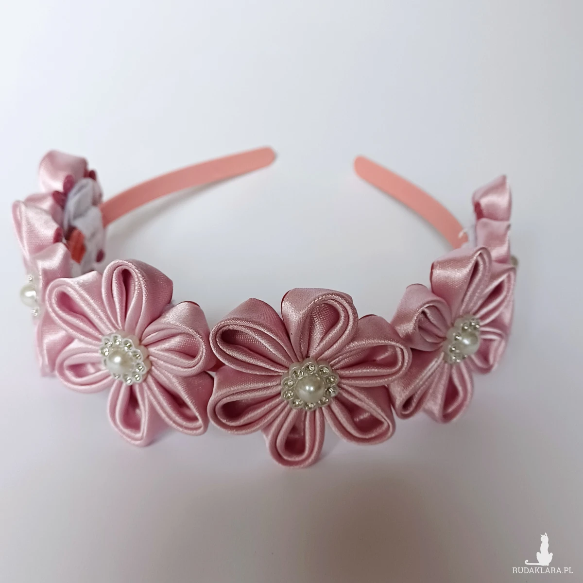 Opaska do włosów jest ozdobiona wykonanymi ręcznie kwiatami ze wstążki. Baza opaski jest plastikowa z ząbkami - rozmiar uniwersalny rozciąga się na 12-17 cm.