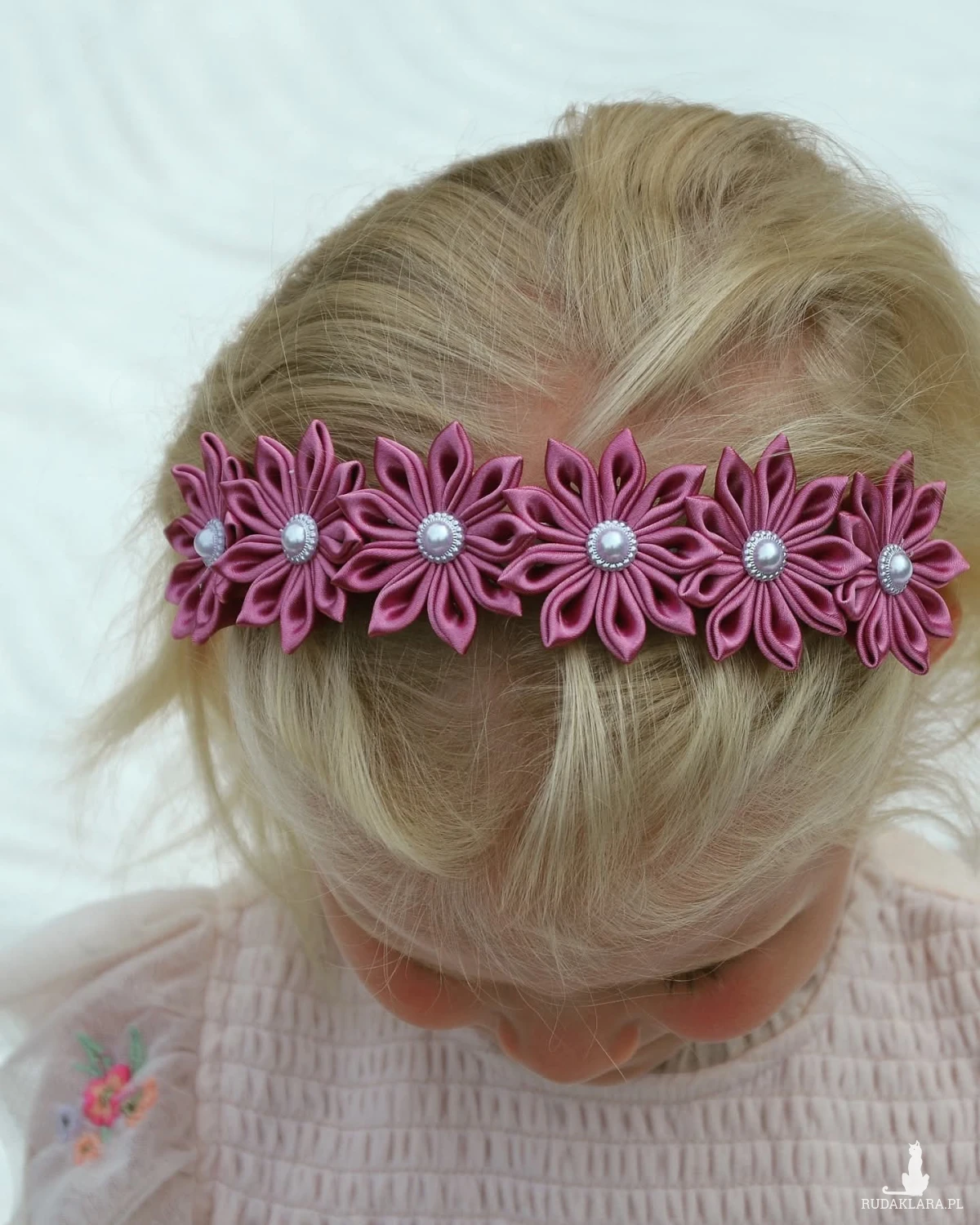 Kwiaty na opasce wykonuję z tasiemek tradycyjną japońską techniką tsunami i były częścią ozdobnych szpilek - kanzashi. Dzisiaj ta technika służy mi do tworzenia współczesnych ozdób na włosy twojego dziecka.