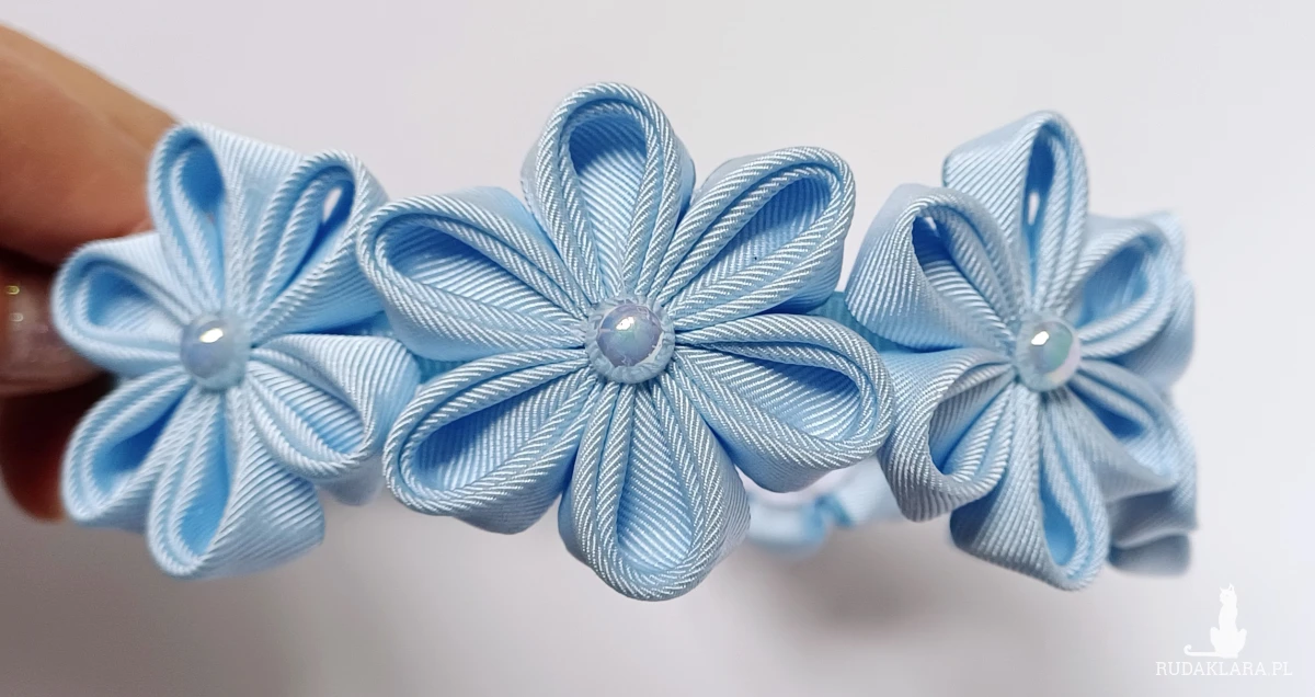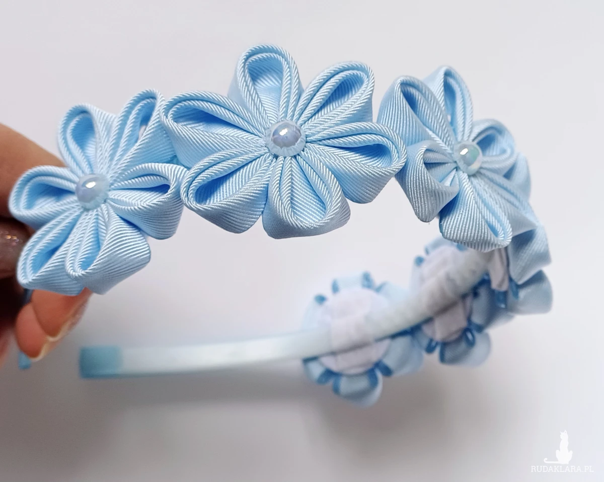 Opaska do włosów jest ozdobiona wykonanymi ręcznie kwiatami ze wstążki. Baza opaski jest plastikowa z ząbkami - rozmiar uniwersalny rozciąga się na 12-17 cm.