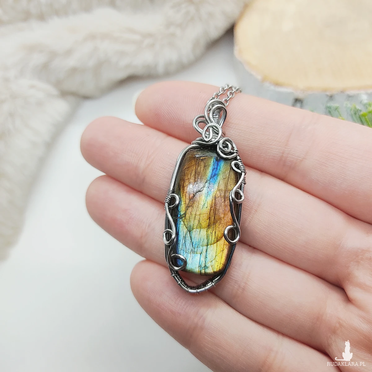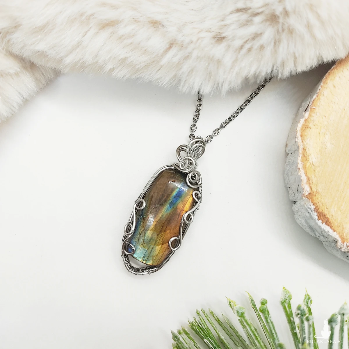 Naszyjnik Labradoryt Wielokolorowy ręcznie robiony. Wykonany techniką wire wrapping z drutów ze stali chirurgicznej. Kamień pod odpowiednim kątem mieni się na złoty kolor.