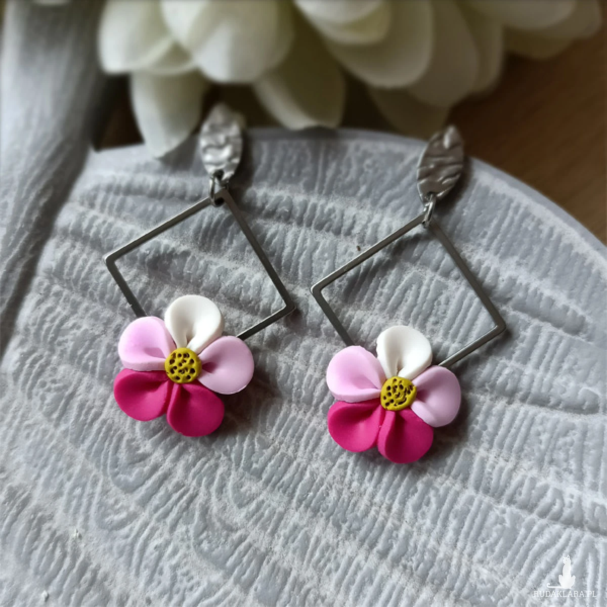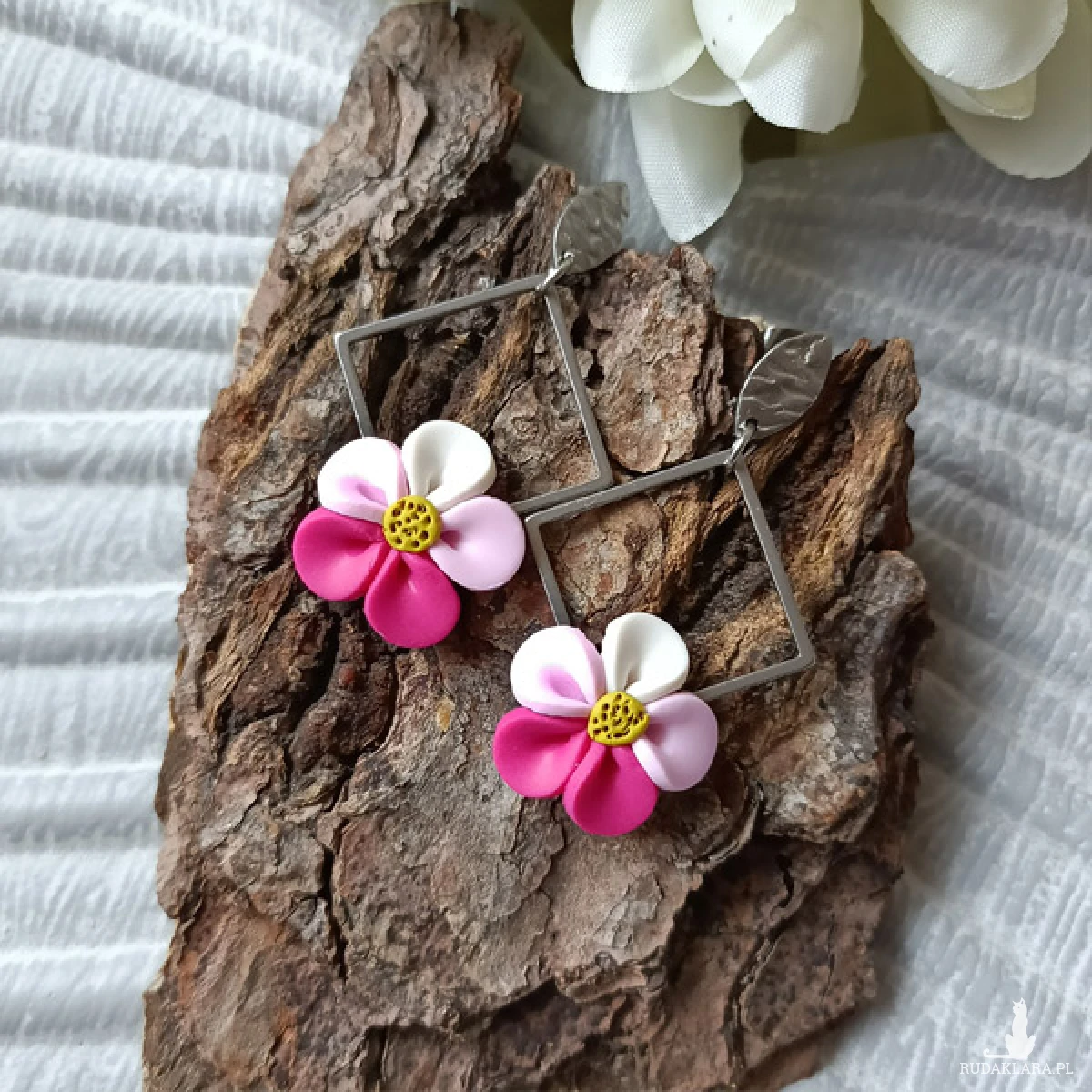 Kolczyki zostały wykonane w całości ręcznie z wysokiej jakości glinki polimerowej. Jest to materiał bardzo trwały, lekki i odporny na wszelkiego rodzaju czynniki zewnętrzne. Kolczyki są w kolorze amarantowym, różowym i białym. Elementy metalowe są ze stali chirurgicznej. Całkowita długość kolczyków 4,5 cm, szerokość 2,8 cm. Są bardzo lekkie i pasują do każdej stylizacji na każdą porę dnia. Biżuteria pakowana jest w ozdobne pudełko.