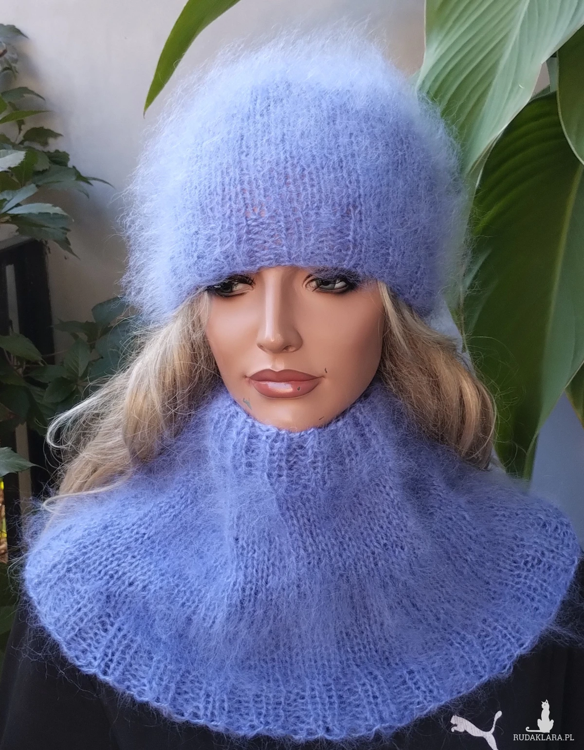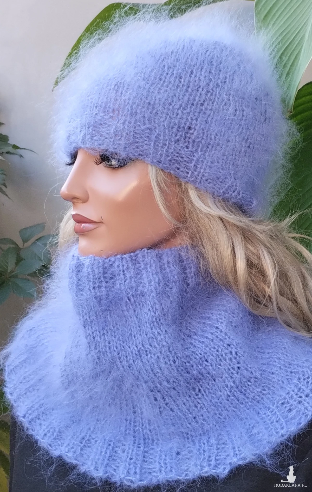 Moherowy komplet czapka i komin,zrobione ręcznie na drutach z mieszanki moheru i akrylu w kolorze jasno niebieskim.Włóczka puszysta, miękka, ma śliczny włos. Rozmiar uniwersalny. Producent włóczki zaleca pranie ręczne w temperaturze 30 stopni, suszyć na leżąco. Płukać w płynie zmiękczającym.