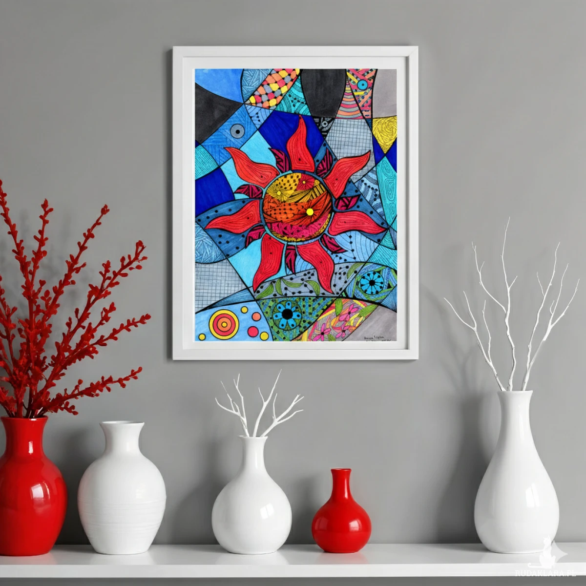 Ekspresyjna, geometryczna ilustracja z dominującym, płonącym słońcem o intensywnie czerwonych i pomarańczowych promieniach. Słońce otoczone jest chaosem abstrakcyjnych, ostrych kształtów  w odcieniach chłodnego błękitu i szarości, co podkreśla kontrast termiczny. Słońce i tło wypełnione są skomplikowanymi wzorami liniowymi, tworząc wrażenie gorąca, wibracji i dramatycznego napięcia między palącym żywiołem a otaczającym go światem.