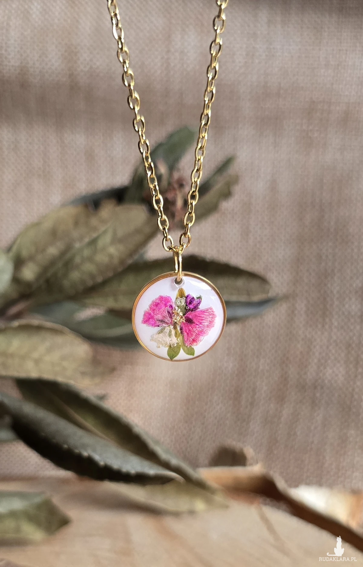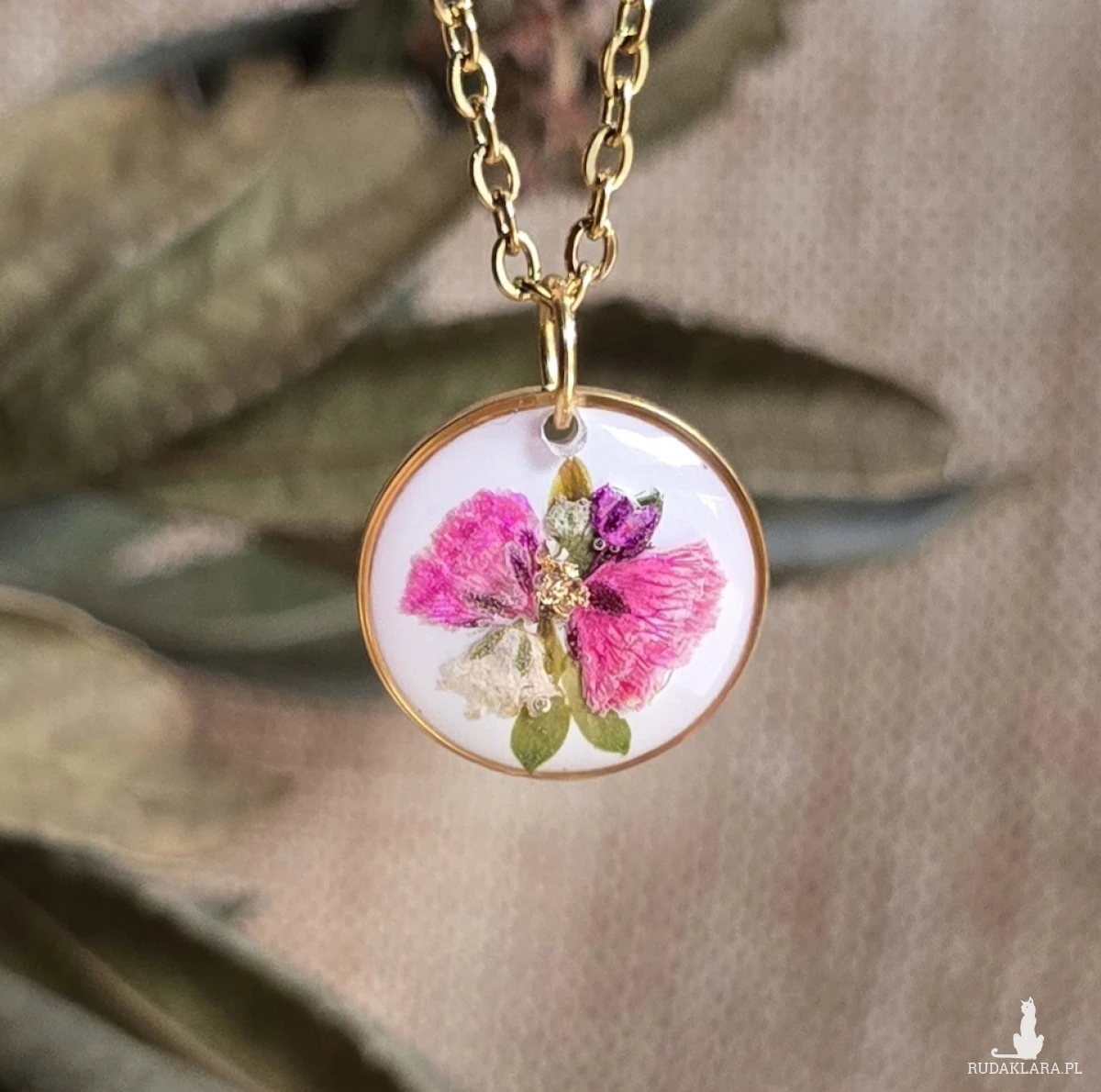 Oferuję Państwu unikalną biżuterię. Zawieszka jest wykonana z suszonych kwiatów i żywicy epoksydowej. Biżuteria jest wspaniałym i oryginalnym prezentem na lata.