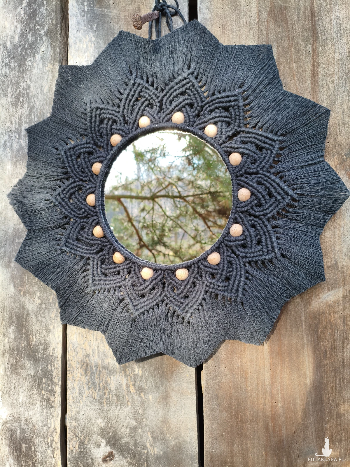 Mandala stworzona z czarnego sznurka 3 mm w skręcanej formie, ozdobiona drewnianymi koralikami, które dodają jej ciepła i niepowtarzalnego charakteru.