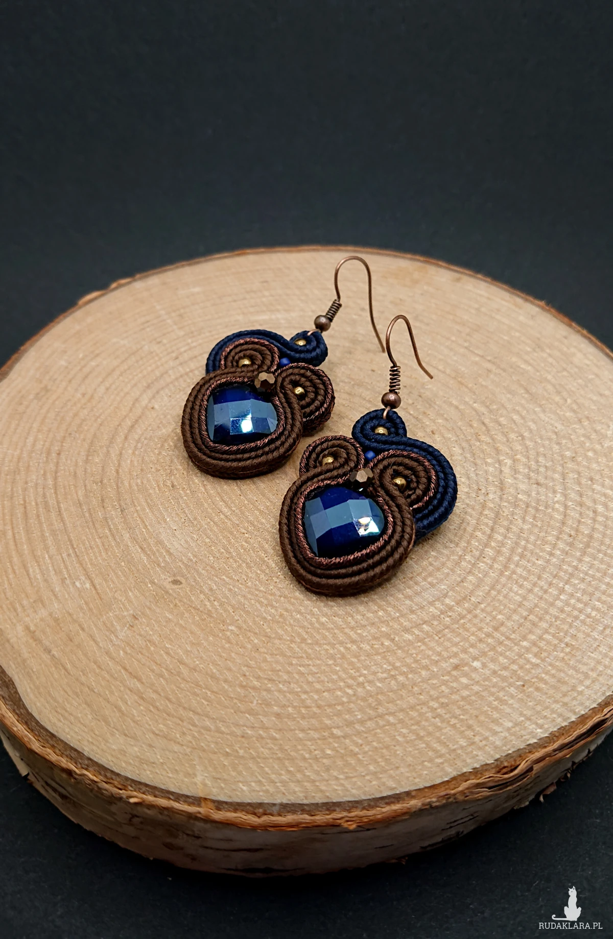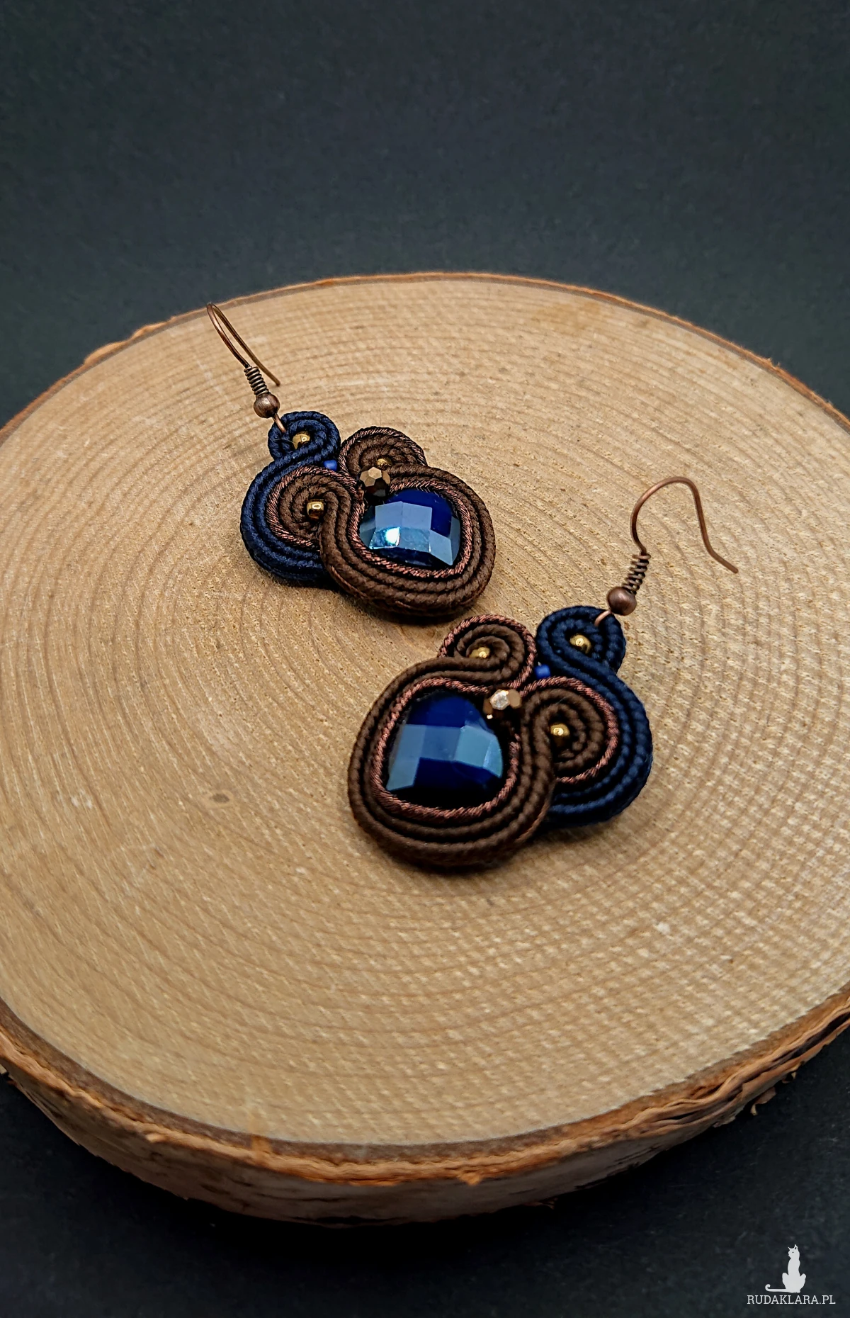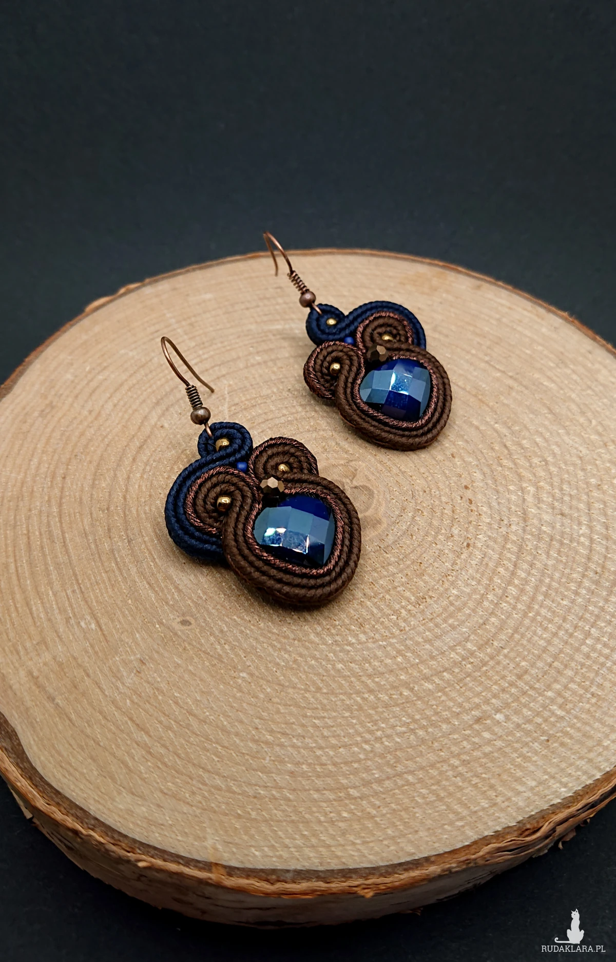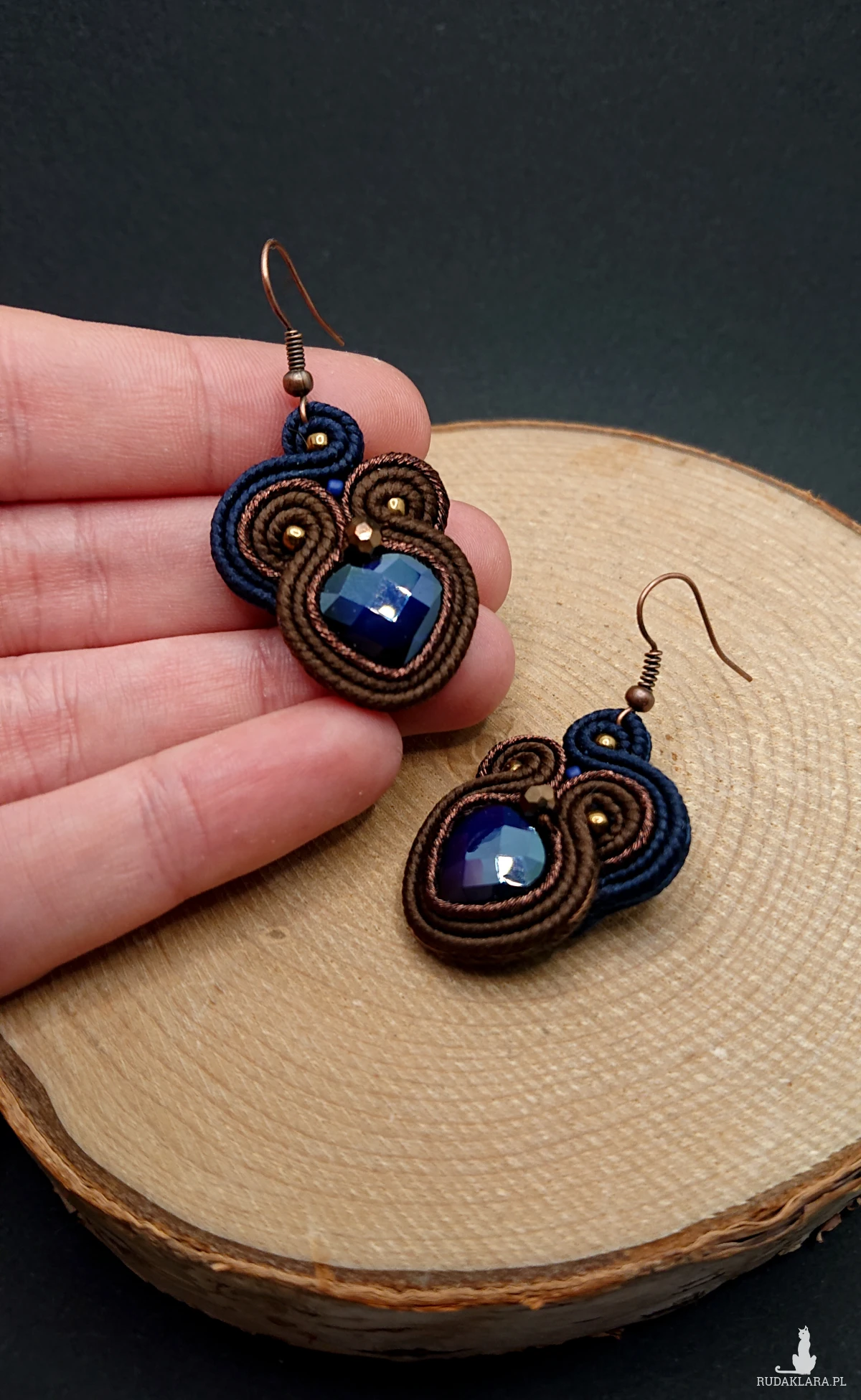 Szklane fasetowane kryształki otoczone polskimi sznurkami sutasz, metalizowanym ozdobnym sznurkiem oraz drobnymi szklanymi koralikami. . Kolczyki zawieszone na klasycznych otwartych biglach w kolorze miedzi.
