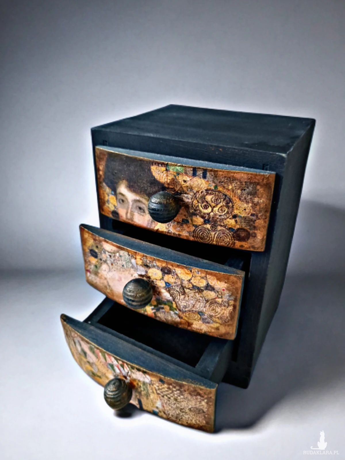 Drewniana szkatułka na biżuterię w kształcie małej komódki, z trzema szufladkami.