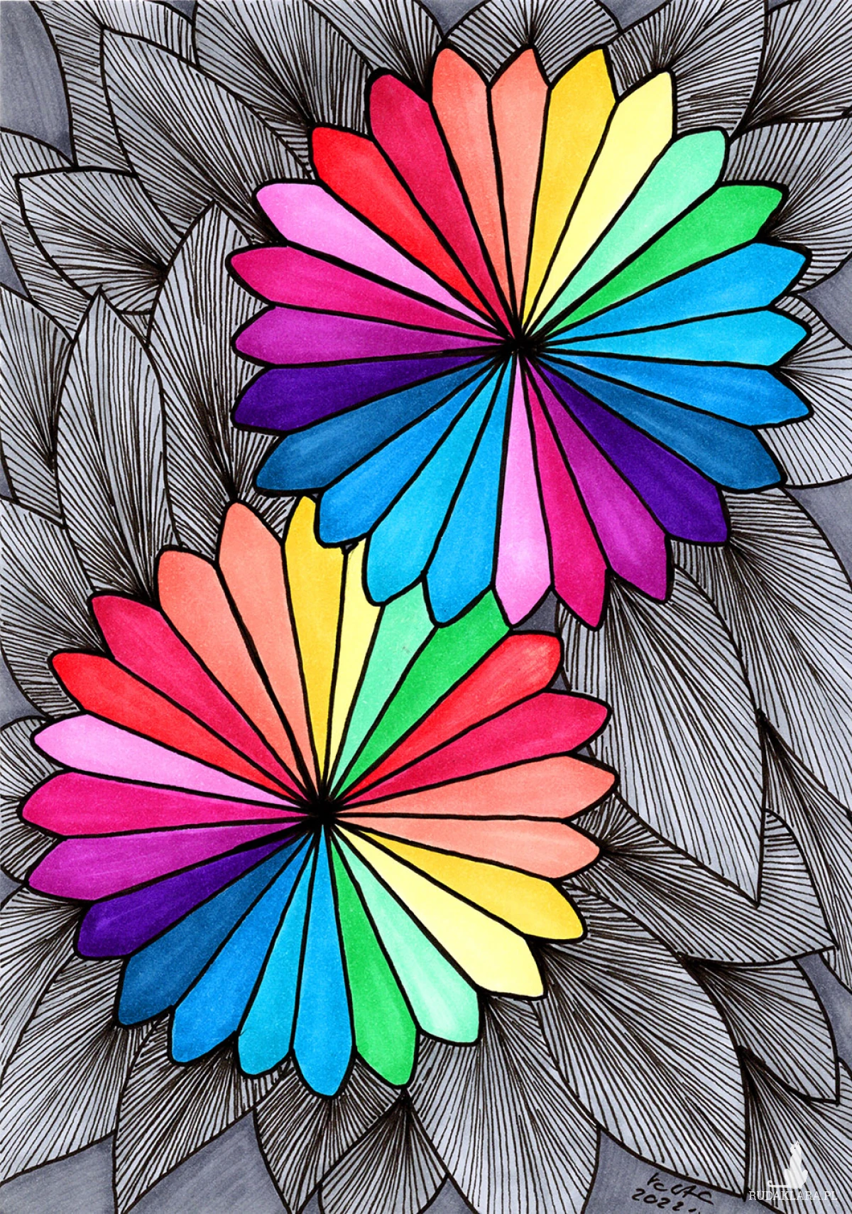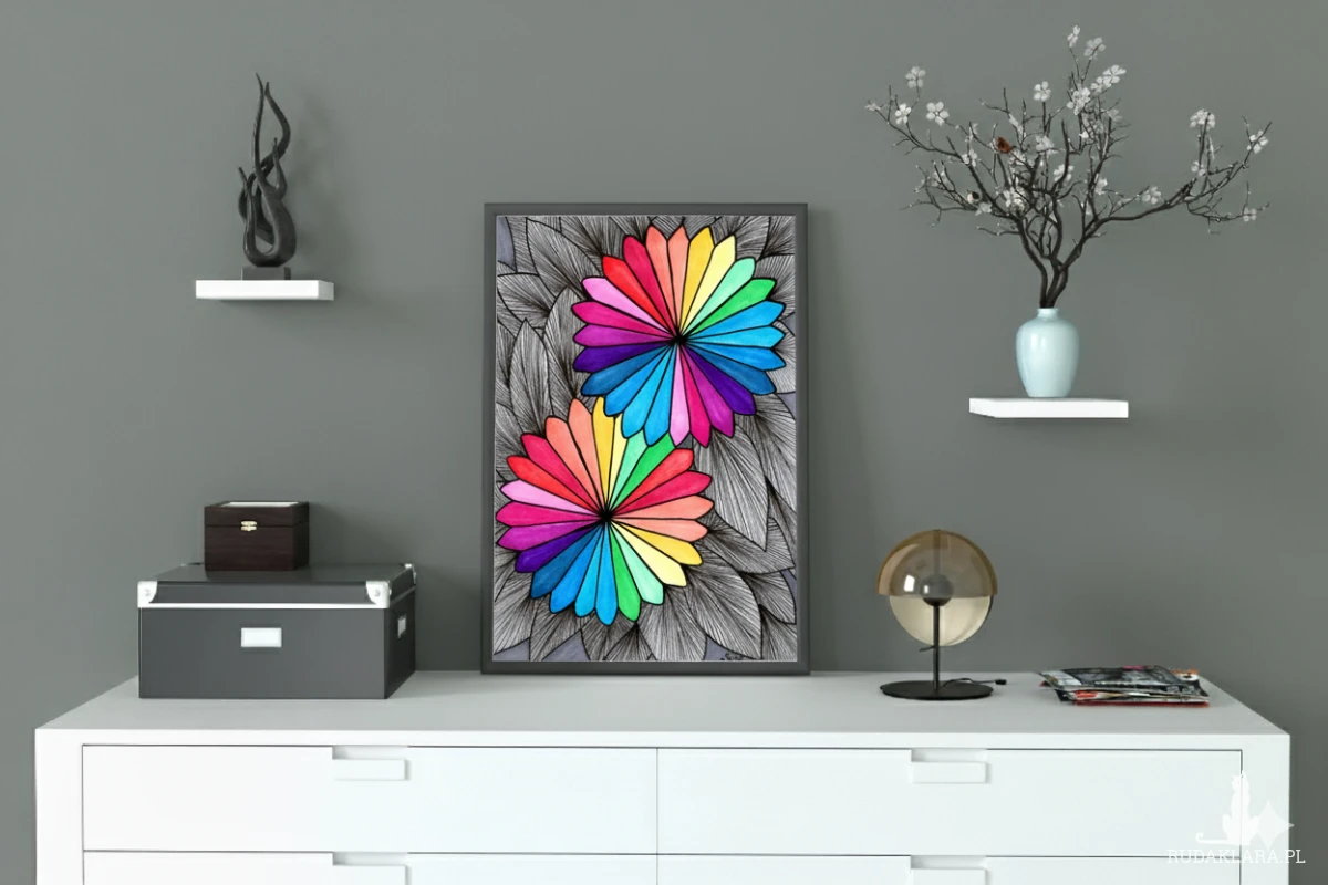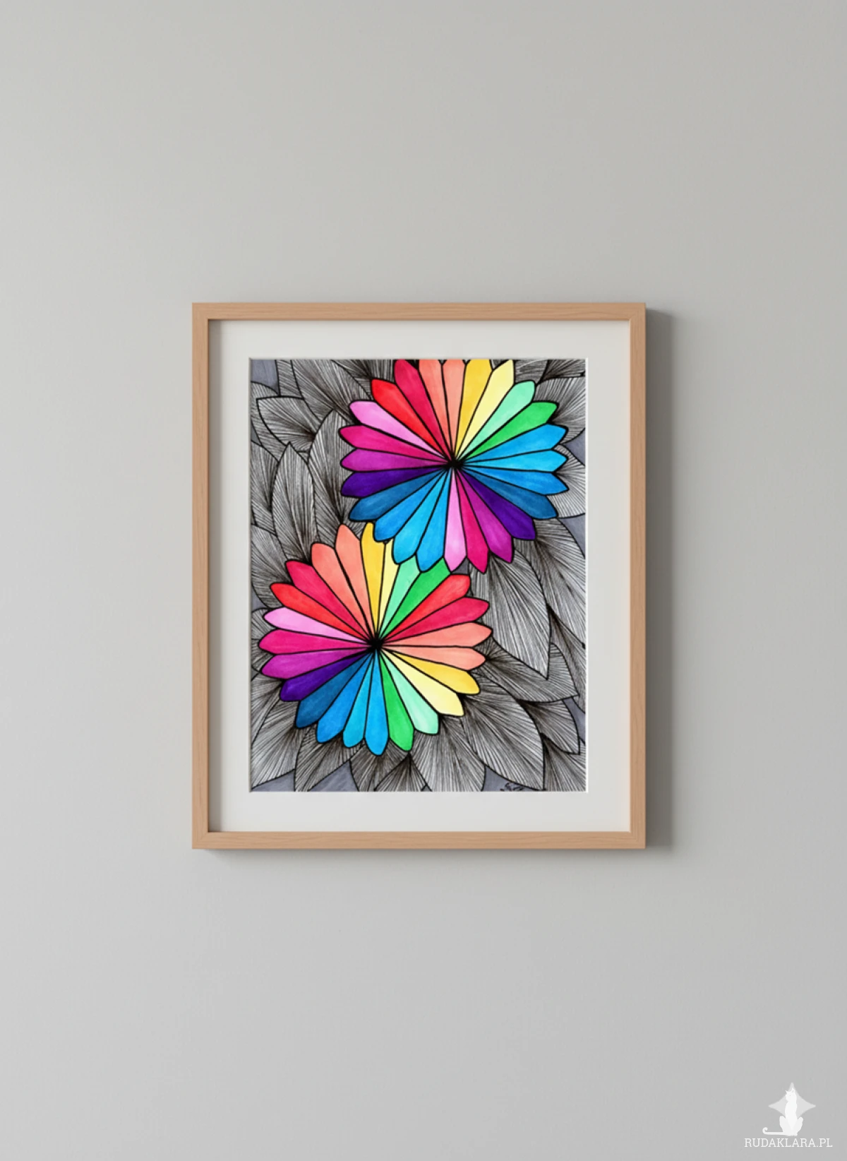 Dynamiczna, jaskrawa ilustracja przedstawiająca dwa duże, stylizowane kwiaty w kształcie promienistych gwiazd. Oba kwiaty mają płatki we wszystkich kolorach tęczy tworząc efekt wibrującego spektrum.