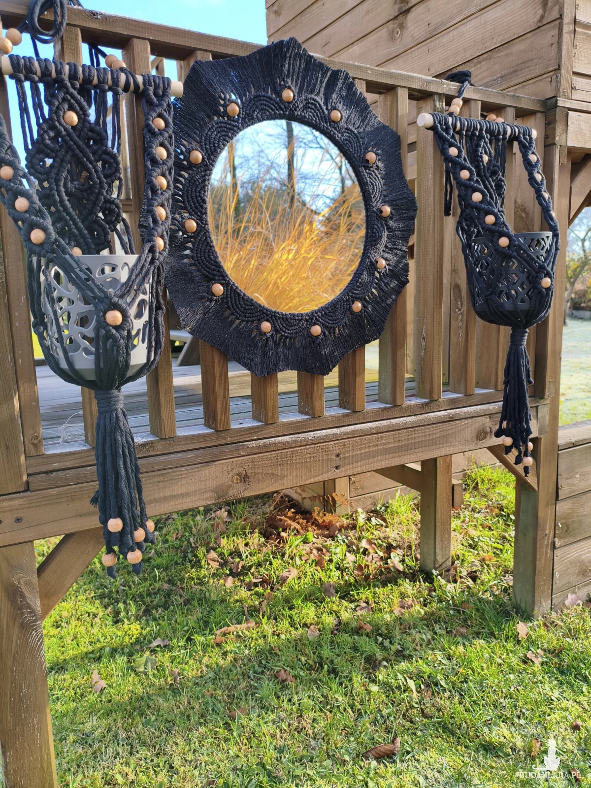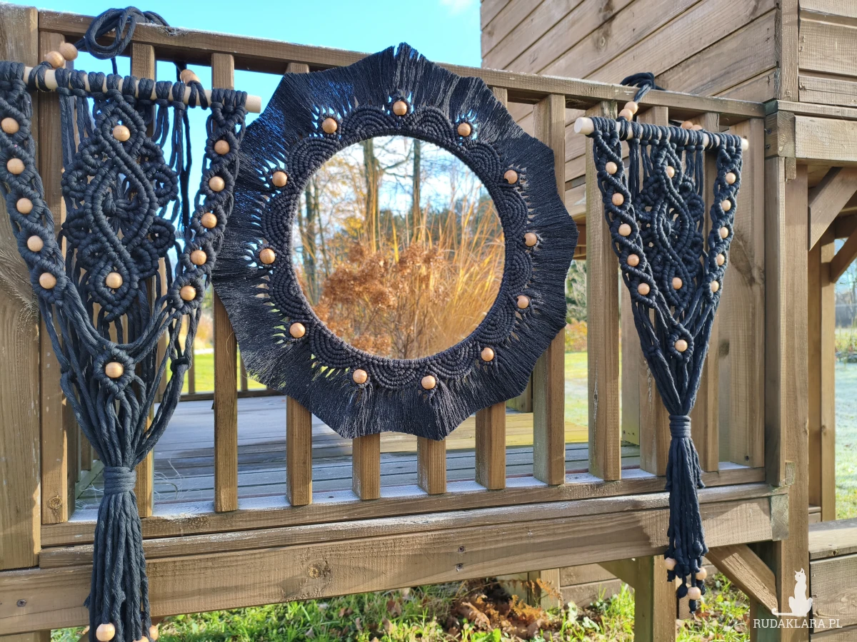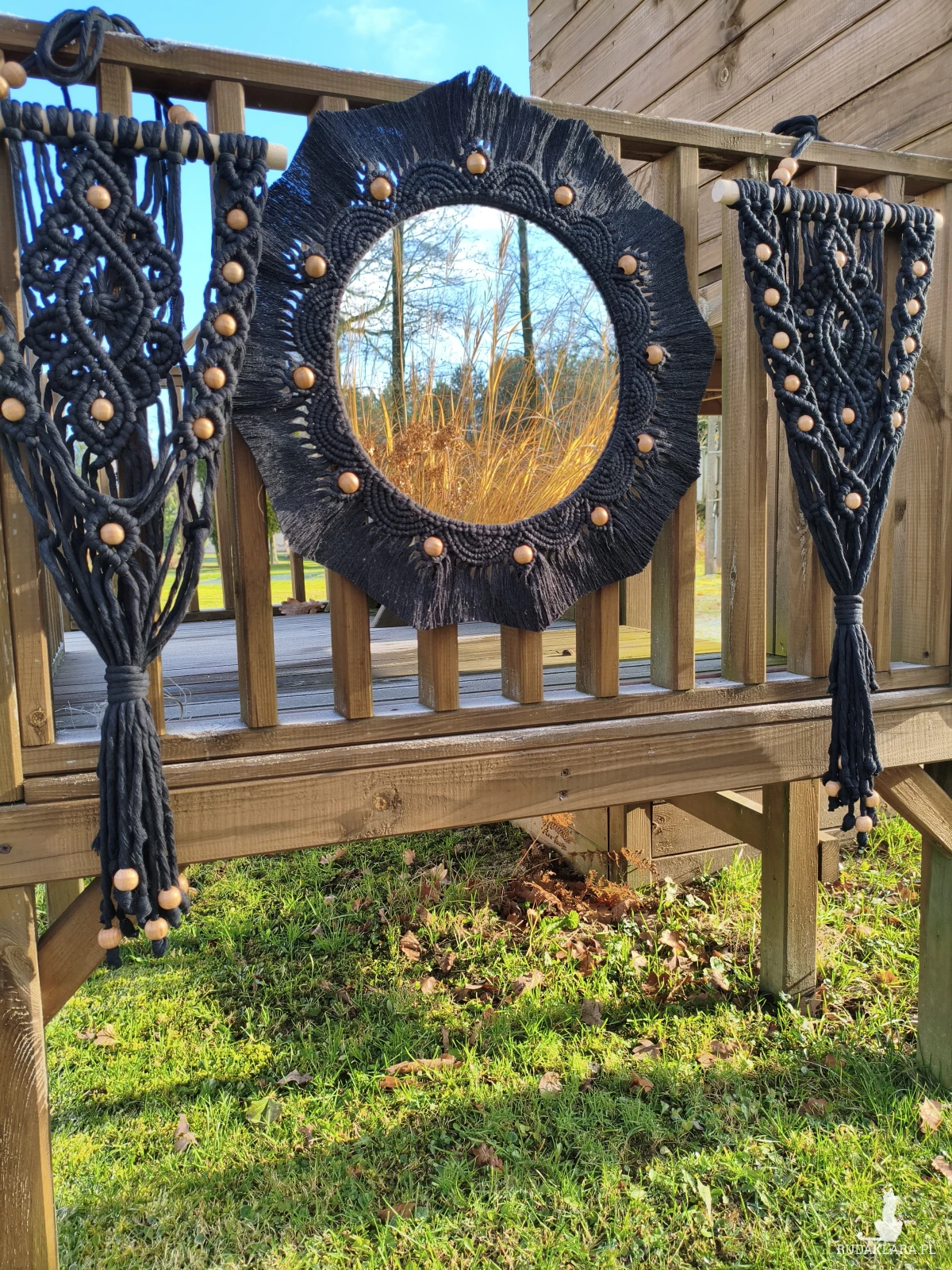 Dwa kwietniki makramowe wyplecione z mocnego sznurka 5 mm w kolorze czarnym, ozdobione drewnianymi koralikami – idealne do wyeksponowania roślin i stworzenia zielonej strefy relaksu. Długość kwietnika wynosi ok 60 cm i szerokość kija 40 cm. Duże makramowe lustro o średnicy całkowitej 50 cm i tafli lustra 30 cm – efektowna dekoracja ścienna, która optycznie powiększa przestrzeń i dodaje jej stylu.
