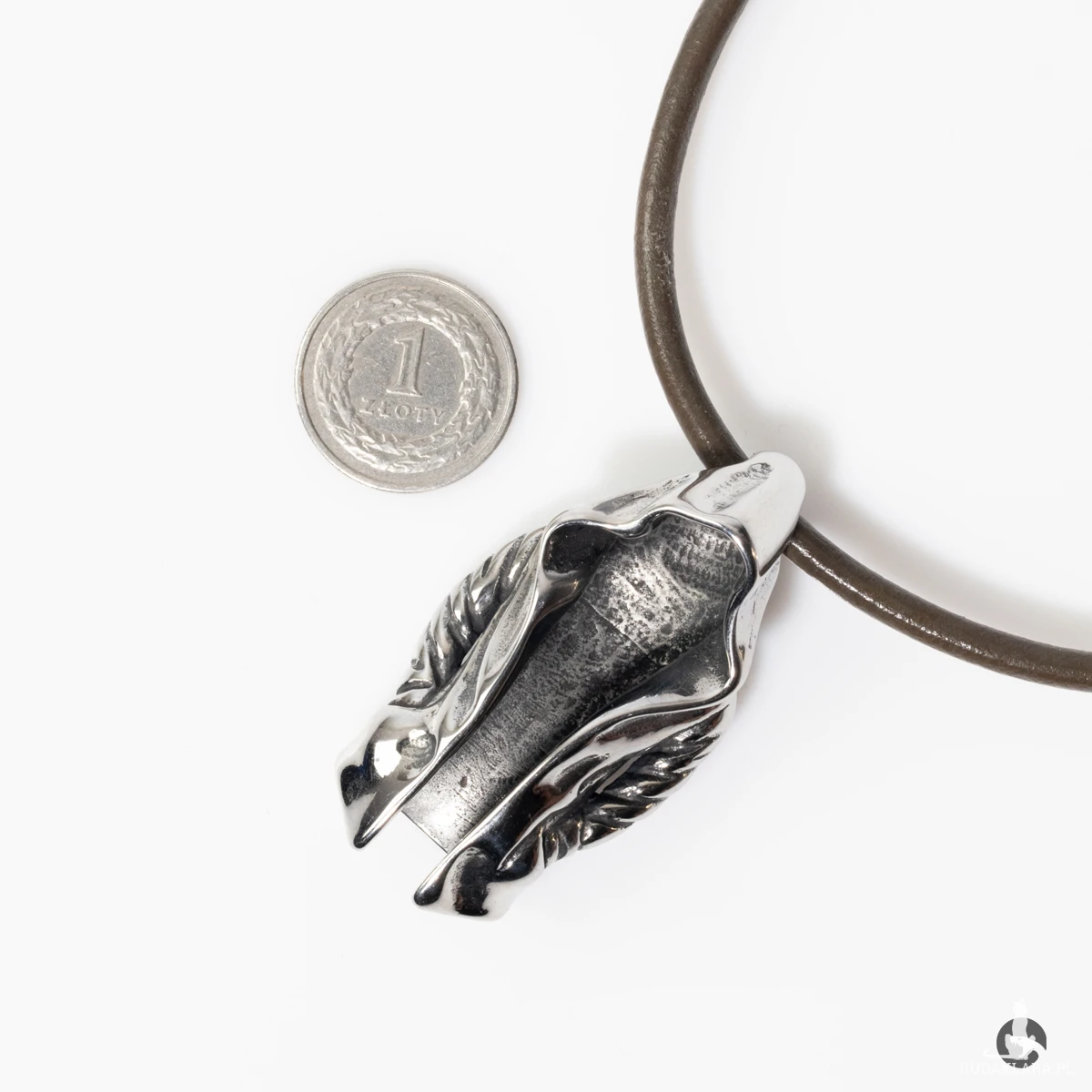 Wykonana z wysokiej jakości stali szlachetnej 316L, zawieszona na solidnym brązowym rzemieniu, doskonale podkreśla charakter noszącej ją osoby.
