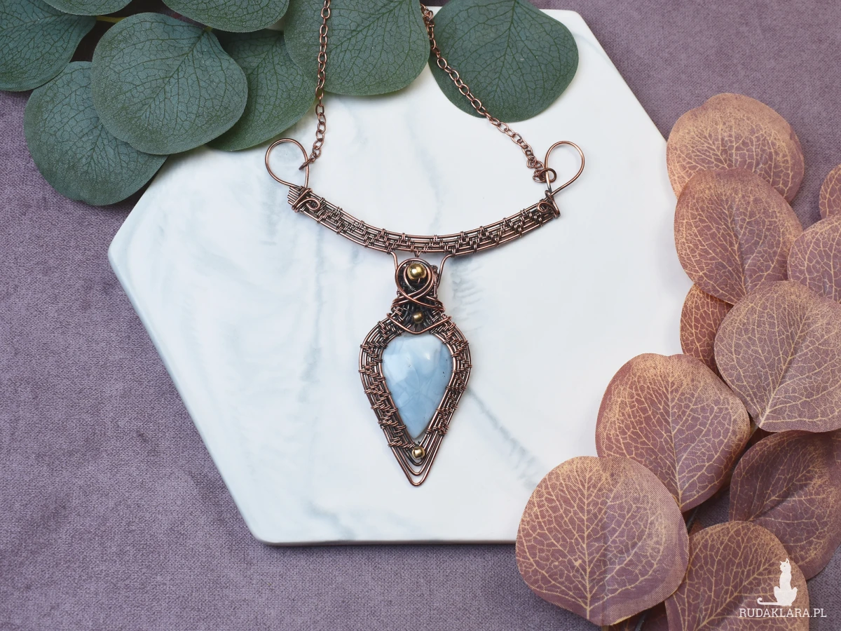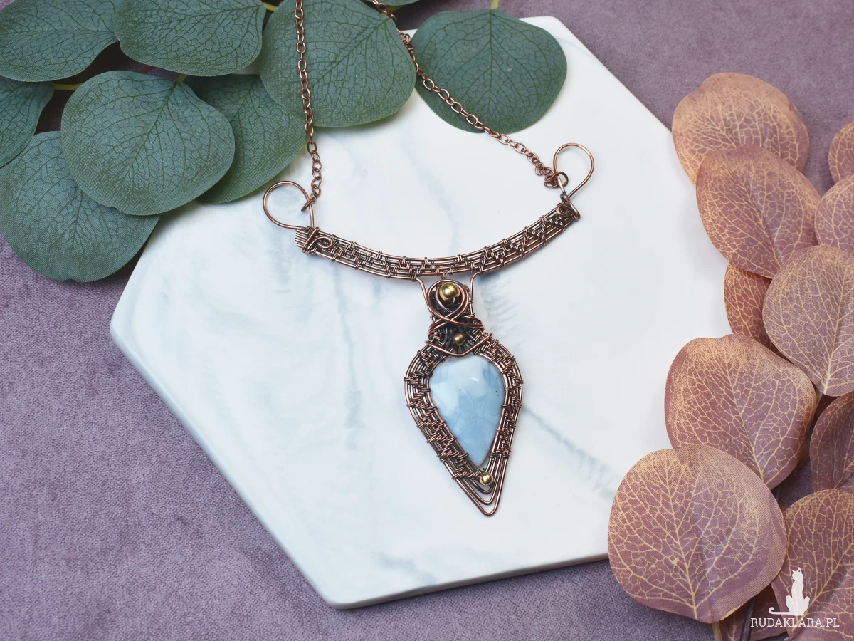 Ten miedziany naszyjnik wykonany techniką wire wrapping zachwyca prostotą i elegancją. Jego sercem jest piękny Owyhee Opal, który emanuje subtelnym blaskiem i niepowtarzalnymi refleksami. Miedź, starannie pleciona wokół kamienia, nadaje całości industrialnego uroku. Naszyjnik emanuje delikatnością i jednocześnie siłą natury, podkreślając unikalność noszącego.