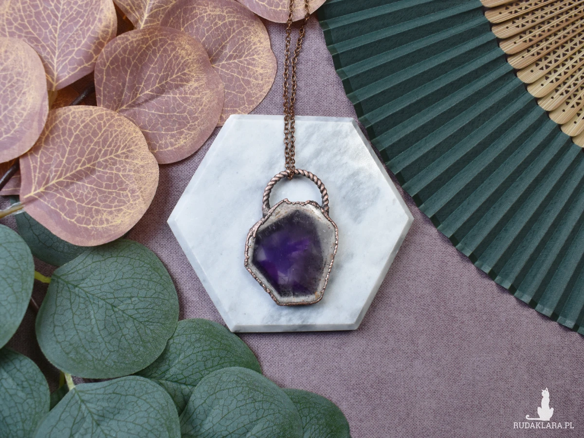 Ręcznie wykonany wisiorek z plastrem ametystu. Oprawa wykonana z miedzi metodą elektroformowania, patynowana.