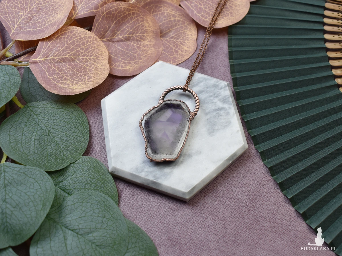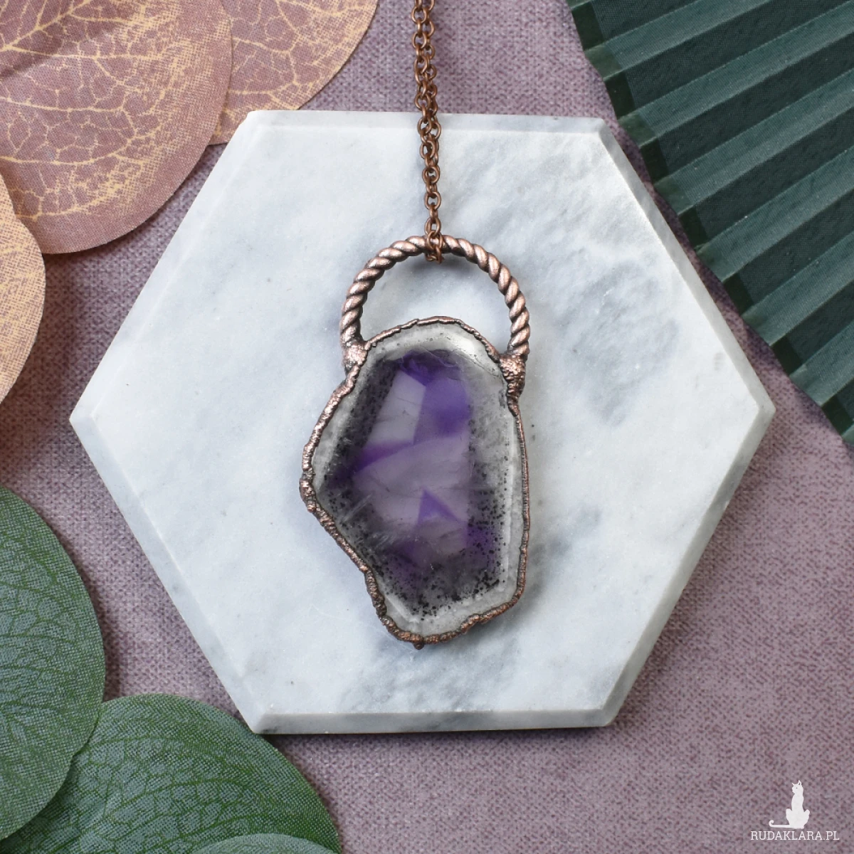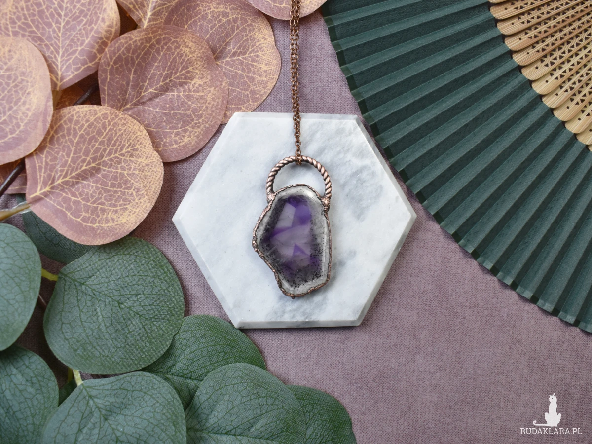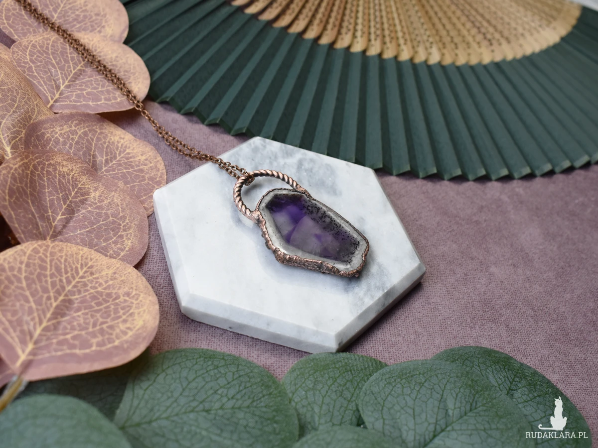 Ręcznie wykonany wisiorek z plastrem ametystu. Oprawa wykonana z miedzi metodą elektroformowania, patynowana.