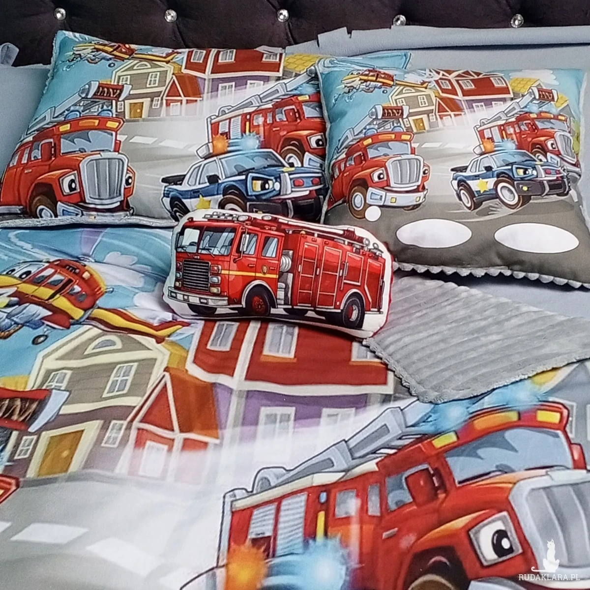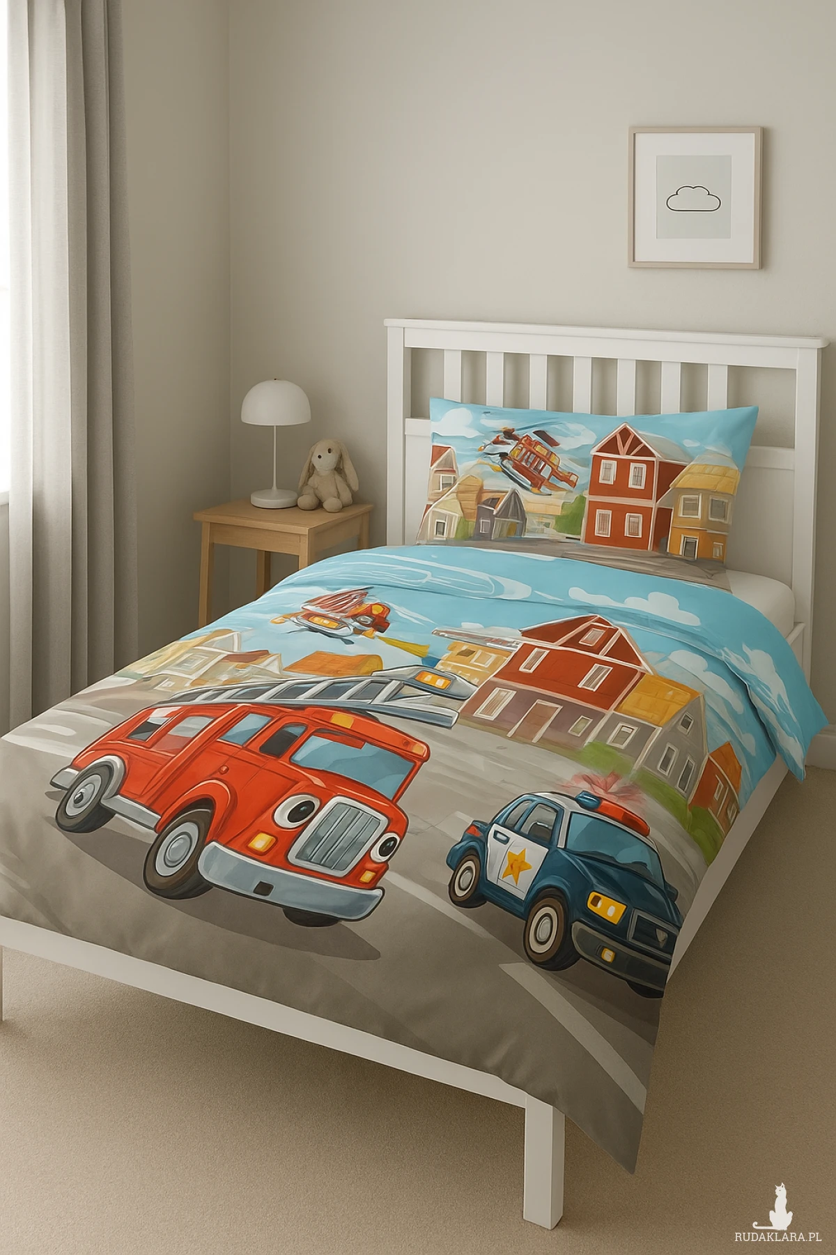 Stwórz dziecku wyjątkową przestrzeń do snu i zabawy dzięki naszemu zestawowi w pełnej energii, kolorowej odsłonie. Intensywne barwy, uśmiechnięte pojazdy i dynamiczna scena z wozem strażackim oraz radiowozem sprawiają, że ta pościel przyciąga wzrok i pobudza wyobraźnię.