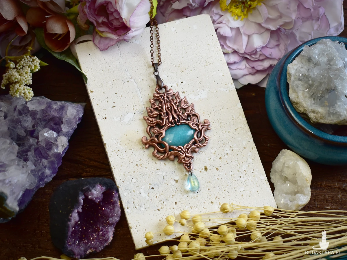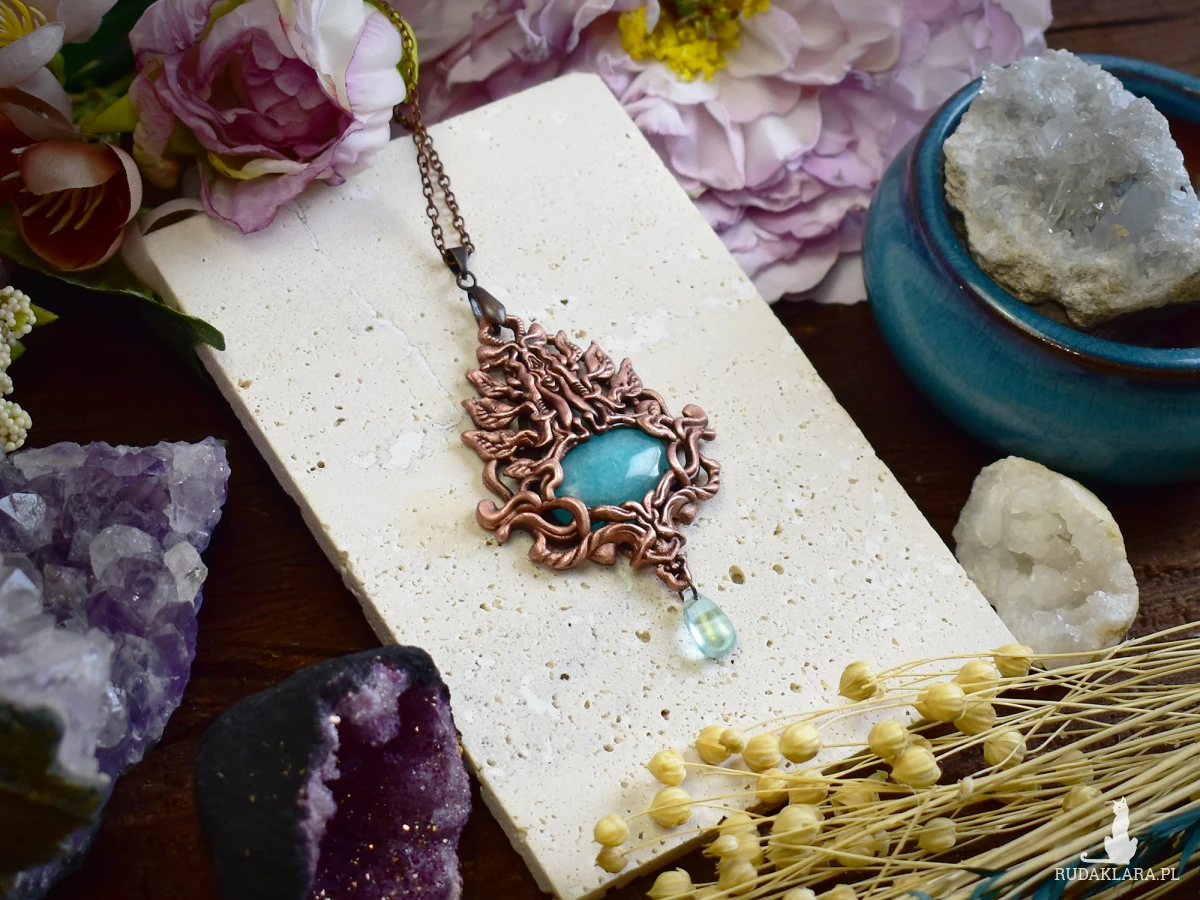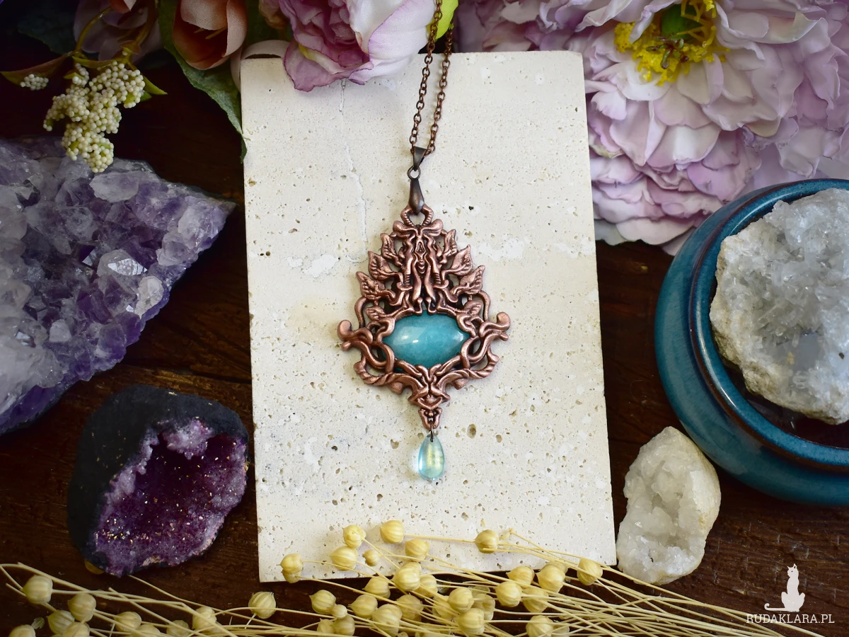 Wisiorek w stylu wiktoriańskim, wykonany z wykorzystaniem techniki elektroformowania, ozdobiony amazonitem i wykończony patyną, która nadaje mu głębi i szlachetnego, postarzanego charakteru. Delikatne detale i ornamentyka inspirowana XIX-wieczną estetyką przywodzą na myśl dawne amulety i biżuterię z epoki, w której symbolika i rzemiosło miały szczególne znaczenie. Amazonit, o swojej chłodnej, zielono-niebieskiej barwie, wprowadza do kompozycji nutę spokoju i harmonii, pięknie kontrastując z ciemniejszą, patynowaną powierzchnią metalu. Całość tworzy elegancki, nastrojowy wisiorek o wyraźnie historycznym charakterze, idealny dla osób ceniących biżuterię artystyczną, styl vintage oraz unikatowe formy inspirowane dawnymi epokami.