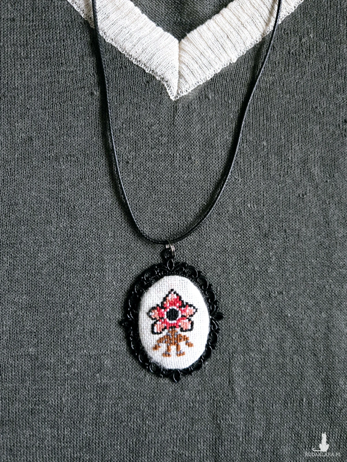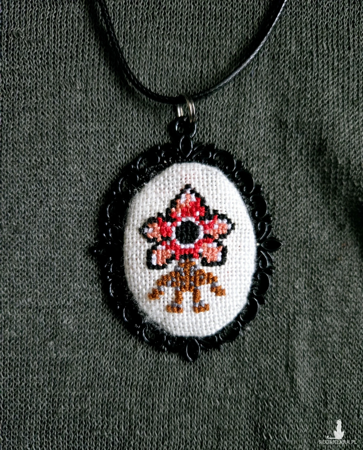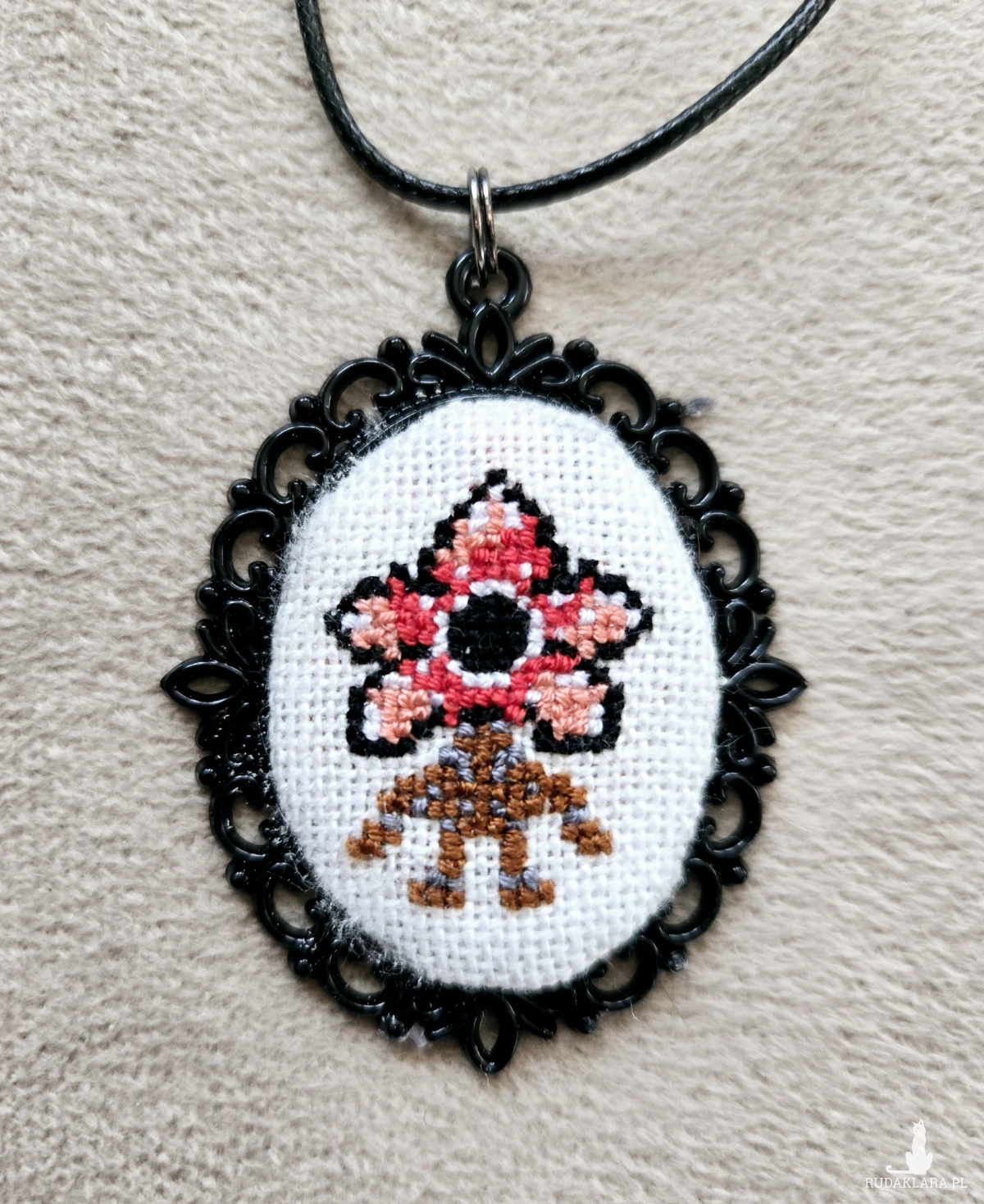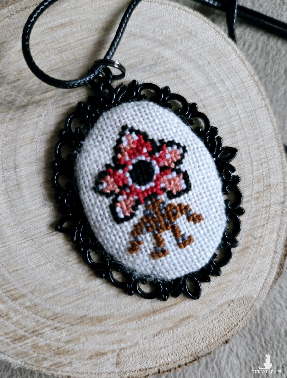 Ręcznie wyszywany wisiorek inspirowany istotą z innego wymiaru. Otwarta paszcza, kontrastowe kolory i surowa forma haftu tworzą niepokojący, mroczny klimat.