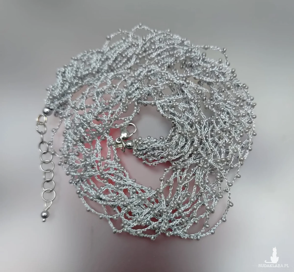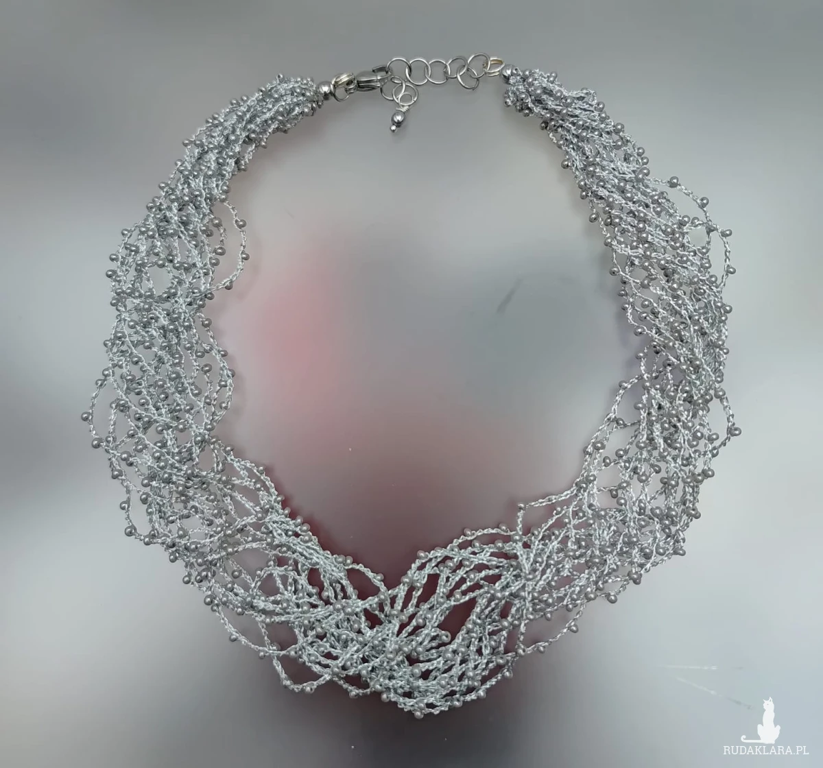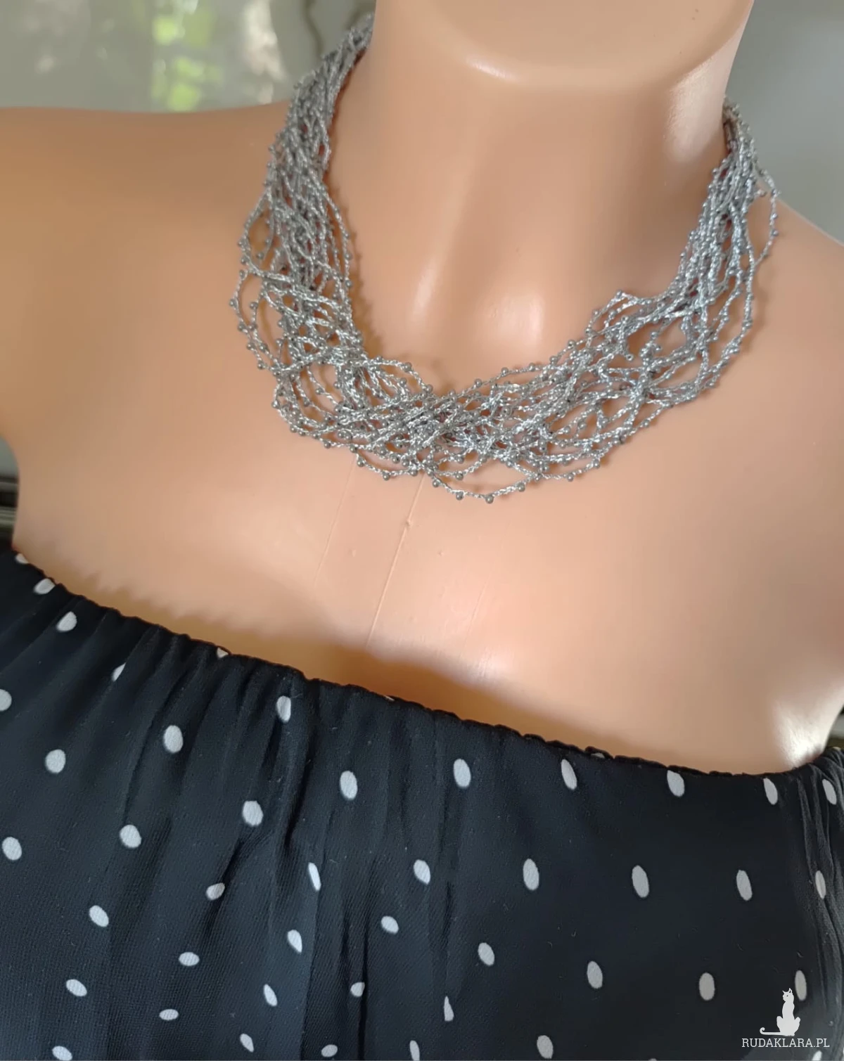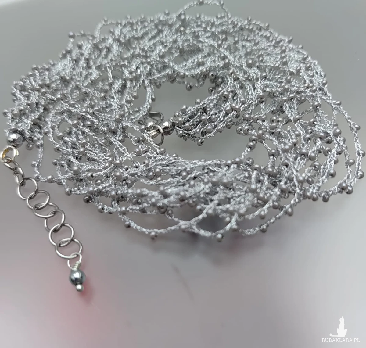 Naszyjnik koraliki na szyje bardzo drobne w kolorze srebrnym, nić