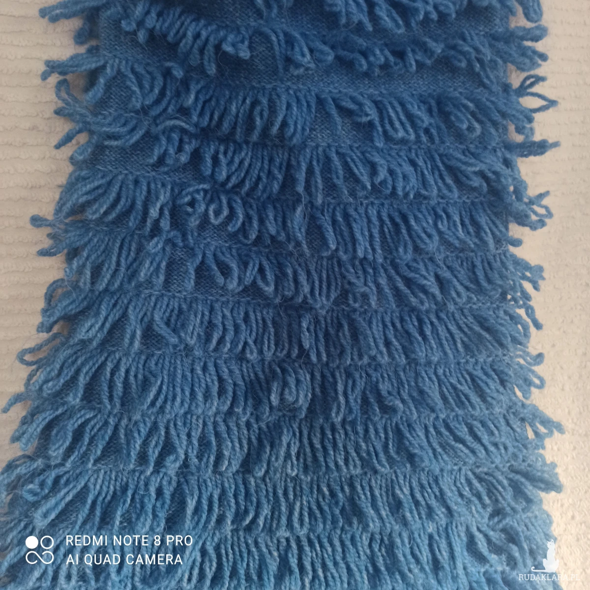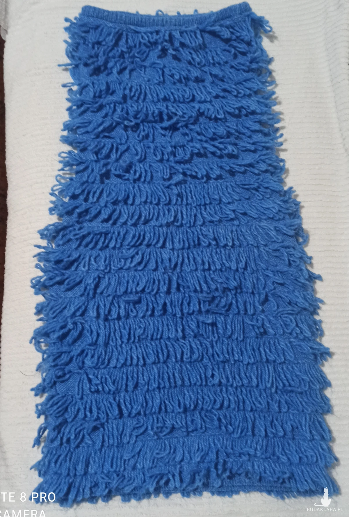 Włóczkowa sukienka w kolorze niebieskiego błękitu bez ramiączek. Jedyna w swoim rodzaju, bardzo ciekawa. W poziomych paskach długie pętelki są wspaniałą jej ozdobą i dodają szyku. Niezwykle przyjemna w dotyku. Wymiary pod pachami max 68 cm, w biodrach max 84 cm, długość całej 72 cm. Wspaniała na prezent.