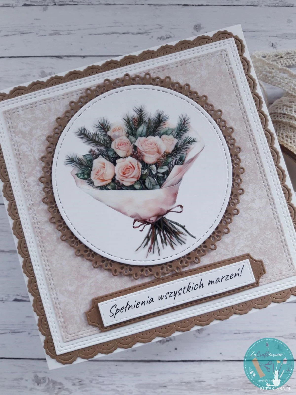 Ręcznie robiona kartka urodzinowa z jasnobrzoskwiniowymi różami i gałązkami świerku wykonana metodą scrapbookingu z wykorzystaniem profesjonalnych materiałów i z dbałością o każdy szczegół.
