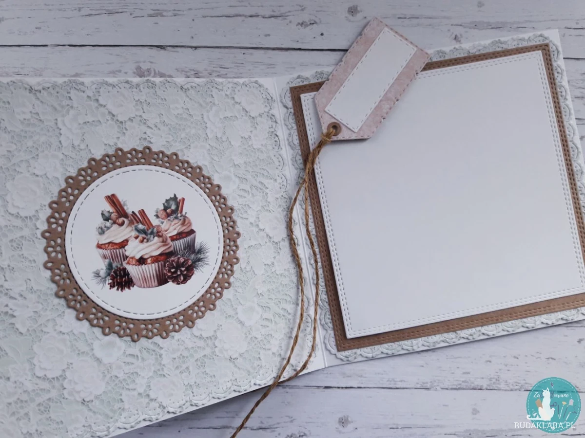 Tył i wnętrze kartki także zostały ozdobione. Wewnątrz jest miejsce na odręczne wypisanie życzeń. Grafika jest wykończona preparatem szklącym i brokatem, który nadaje jej piękny połysk.