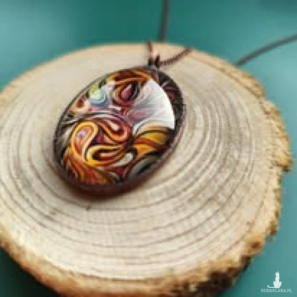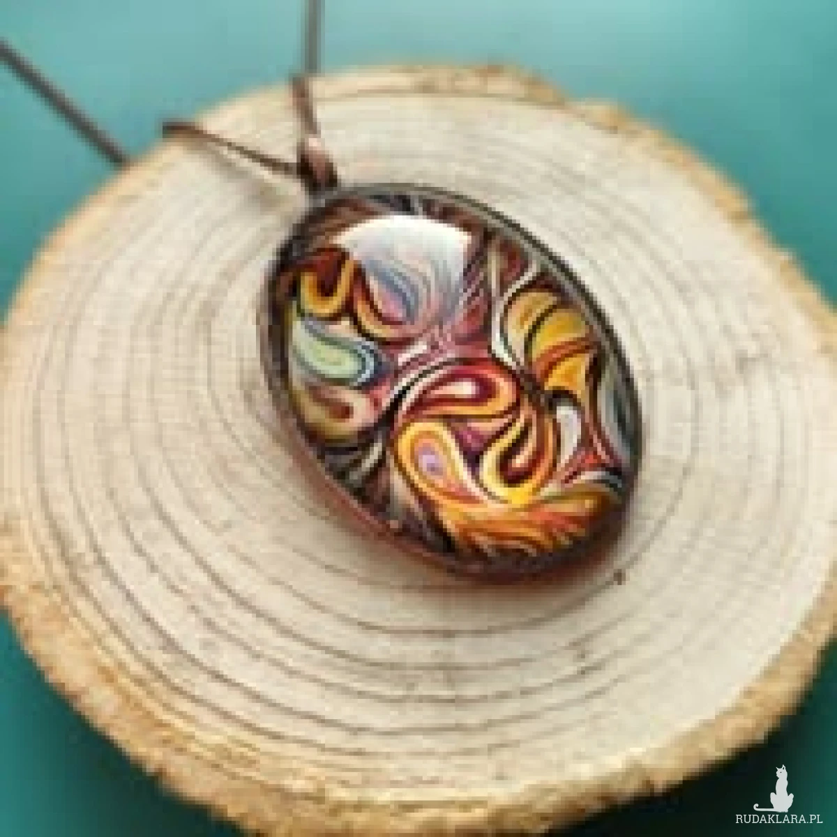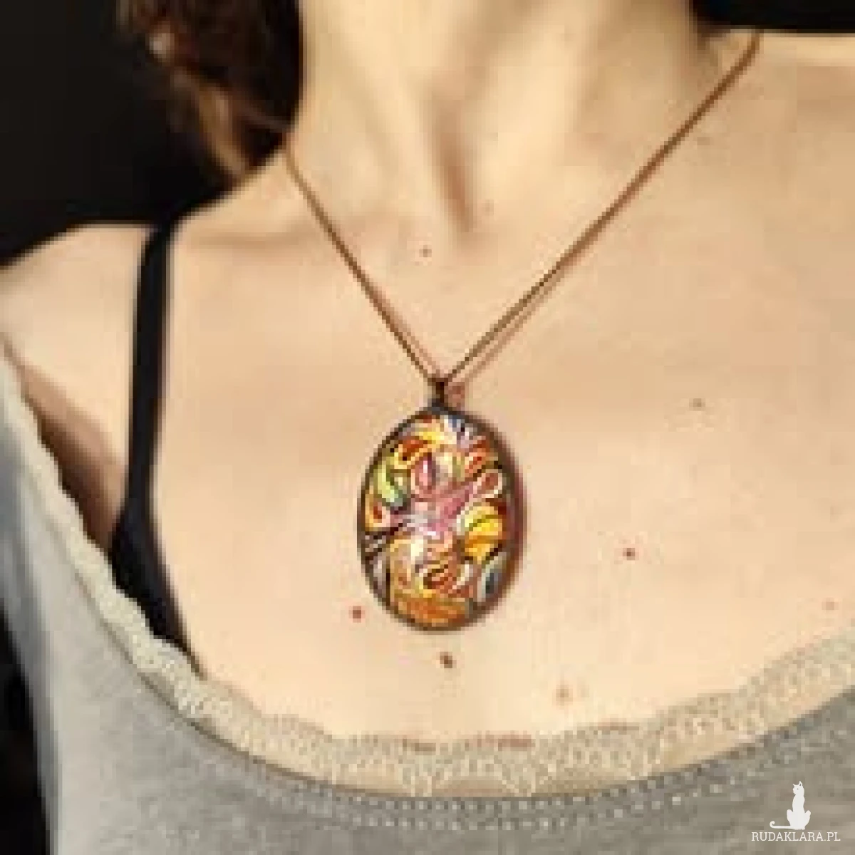 Grafika pod szkłem oprawiona miedzią. Naszyjnik z wisiorem.