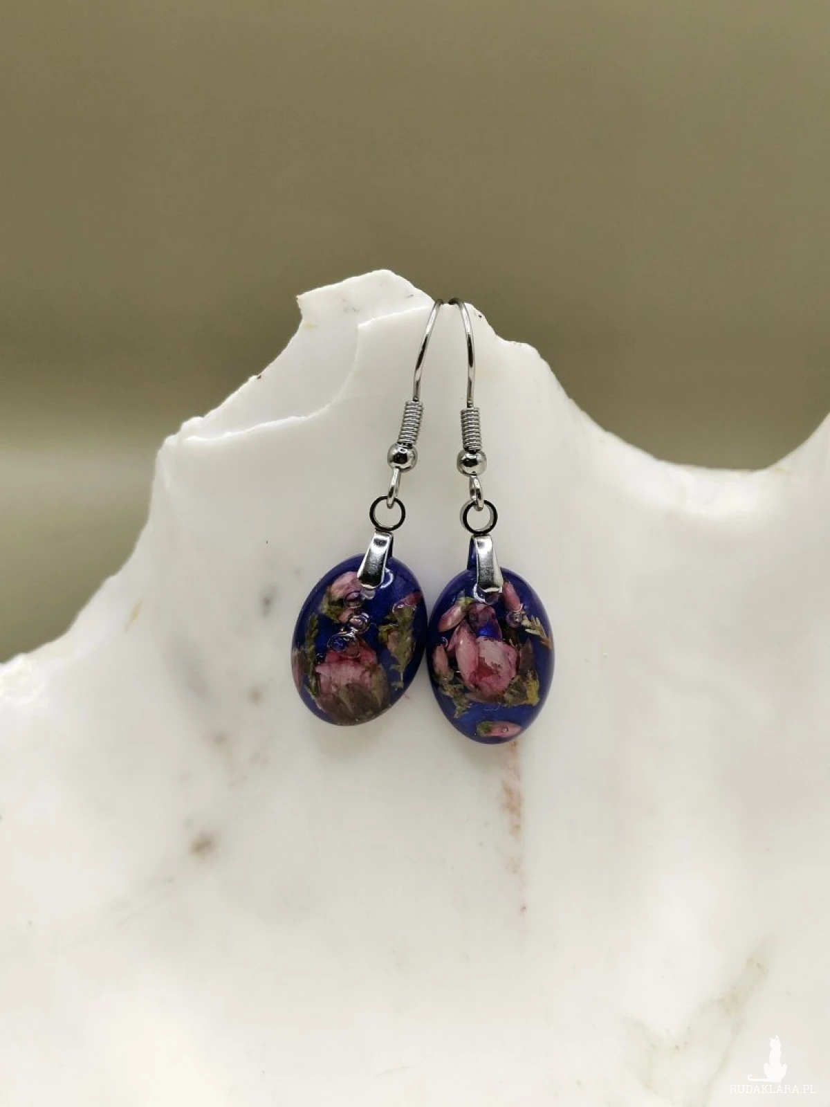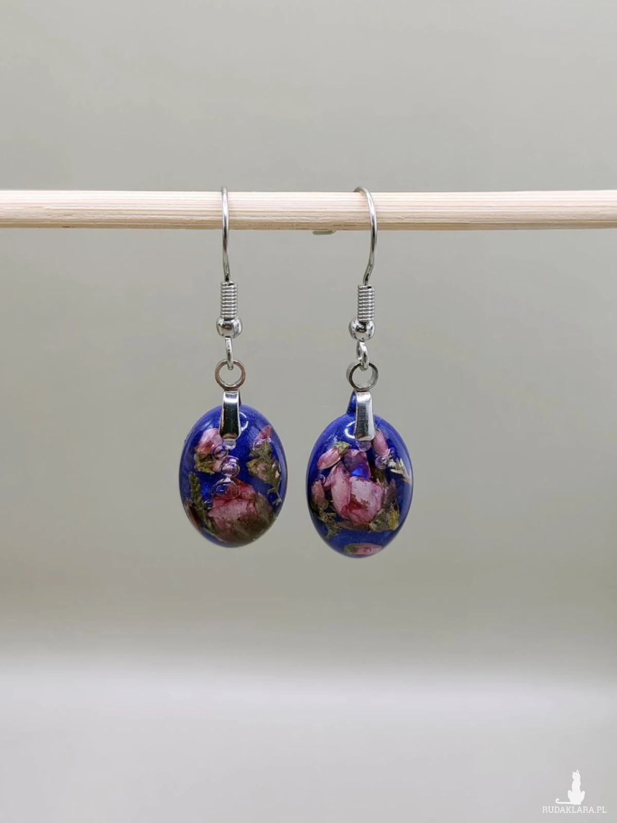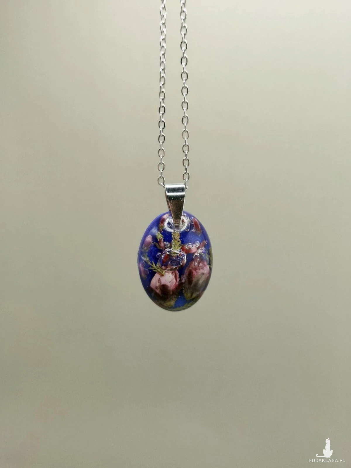 - Materiał: żywica epoksydowa, suszone kwiaty, elementy metalowe w kolorze srebra