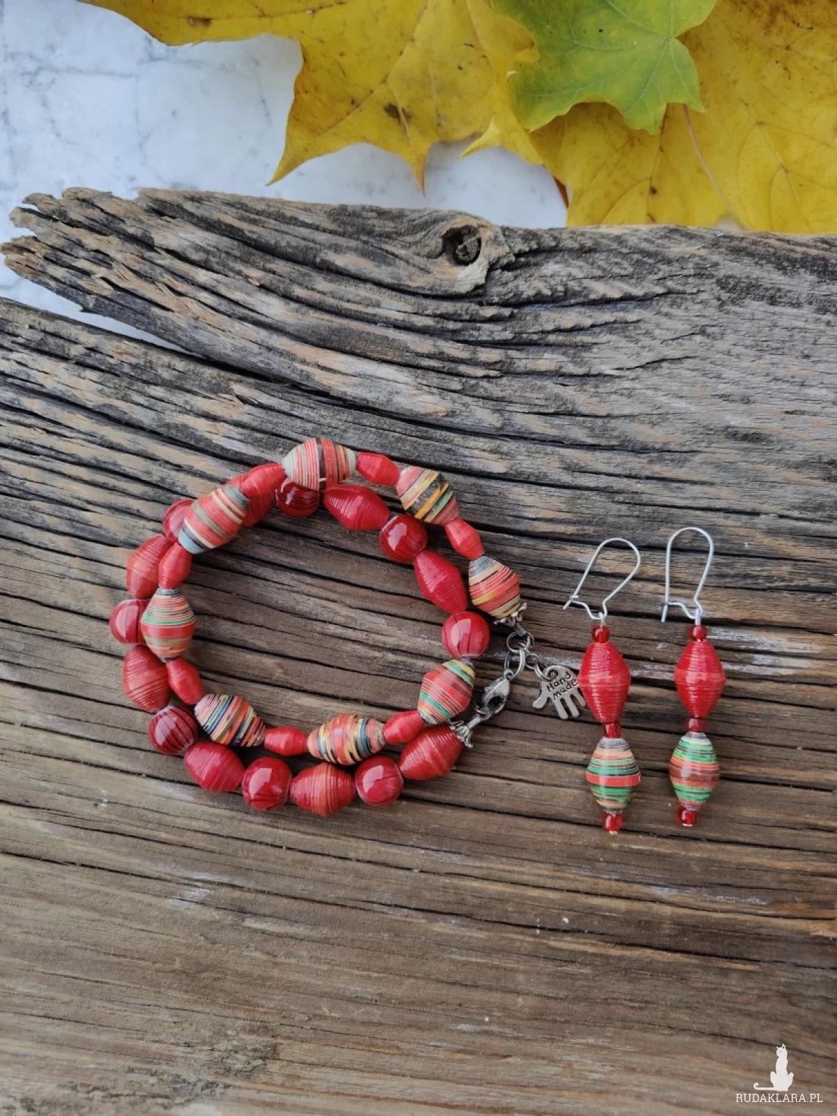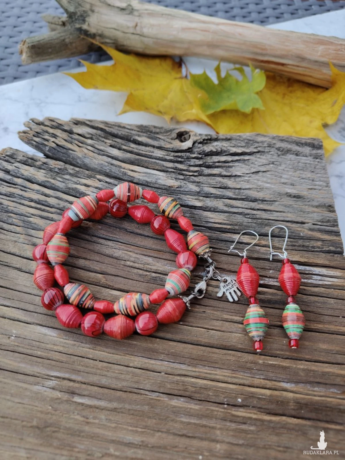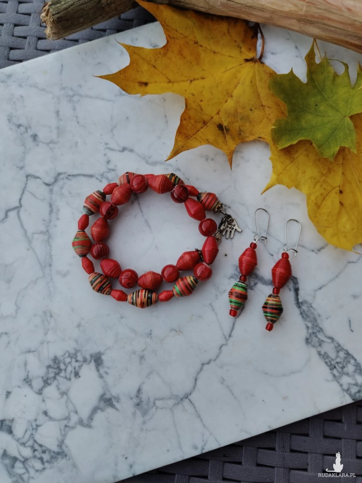 Ten wyjątkowy komplet biżuterii powstał z myślą o osobach, które kochają oryginalne dodatki, ekologiczne materiały i wyraziste kolory. Ręcznie zwijane koraliki z papieru tworzą niepowtarzalny wzór – każdy element ma własny charakter, dzięki czemu Twój zestaw będzie jedyny w swoim rodzaju. Ciepłe, intensywne odcienie czerwieni i wielobarwnych akcentów idealnie komponują się z jesienną aurą, dodając stylizacjom energii i artystycznego wyrazu. To biżuteria, która przyciąga spojrzenia i podkreśla Twoją kreatywność.