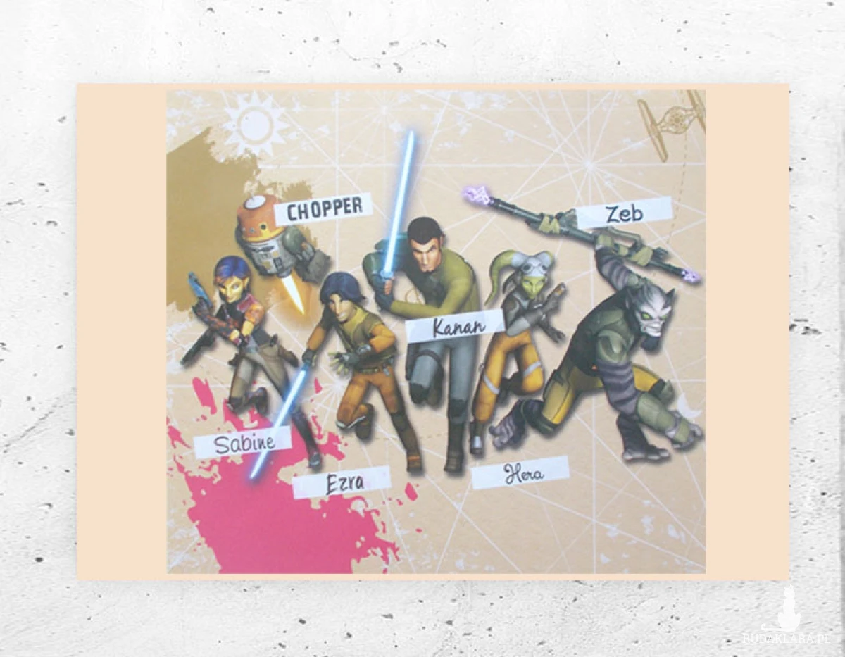 Nowy plakat z animowanych "Gwiezdnych wojen". Obrazek na kremowym kartoniku w rozmiarze 21 x 30 cm. Plakat wystarczy tylko oprawić w ramkę A4. Grafika na ścianę do pokoju młodzieżowego lub dziecięcego, sypialni, jadalni, przedpokoju, biura, holu, restauracji itp. Poster będzie pasował do wnętrz urządzonych w stylu nowoczesnym, loftowym, minimalistycznym, skandynawskim, mieszanym.