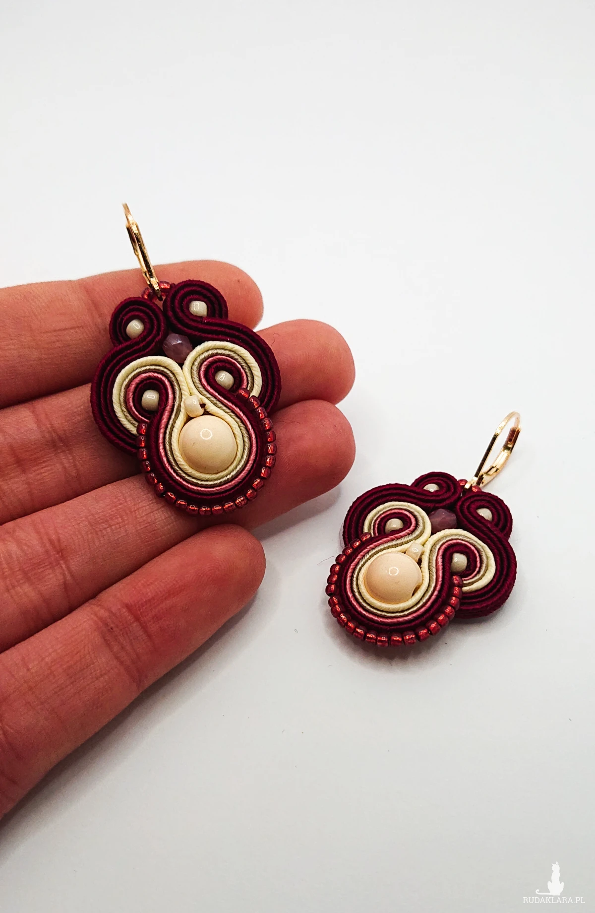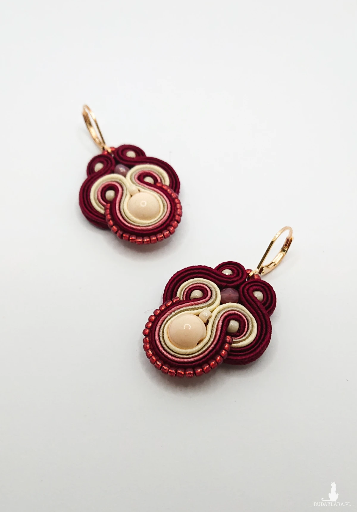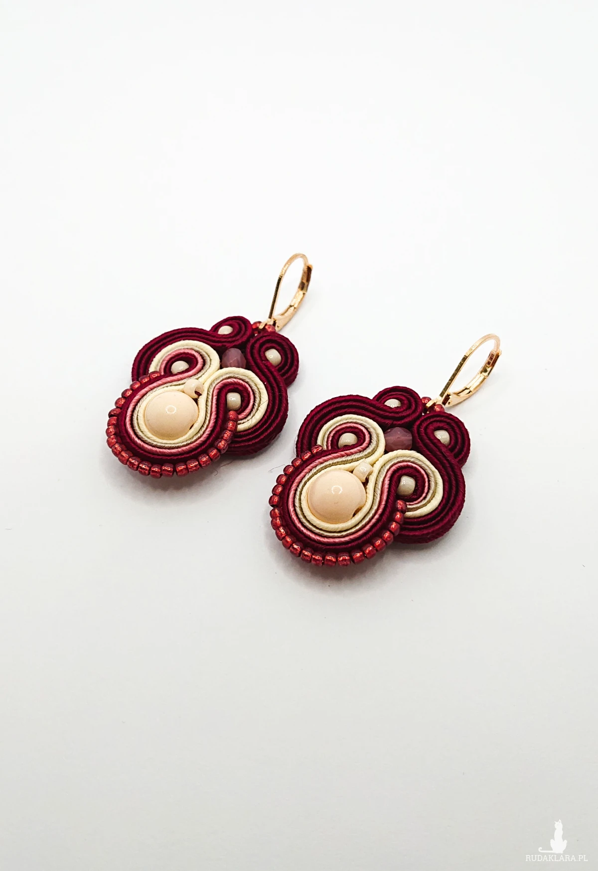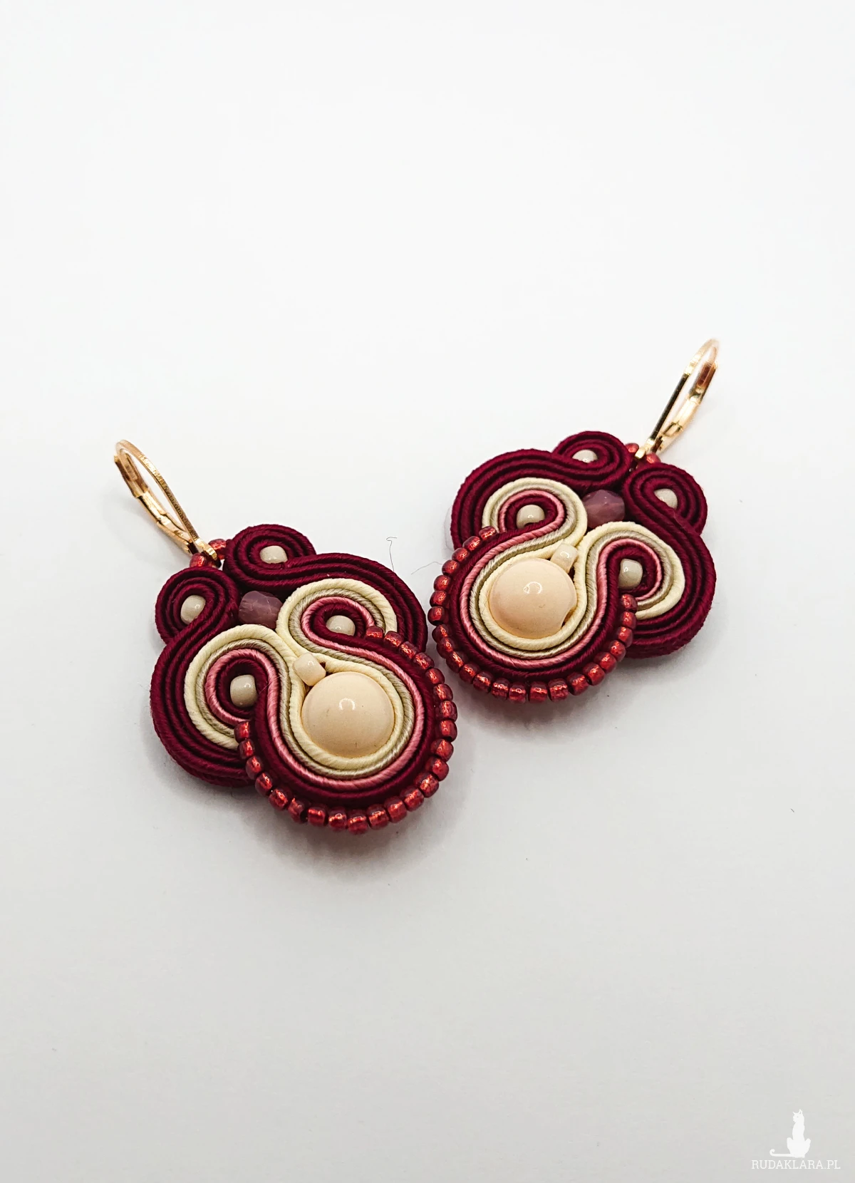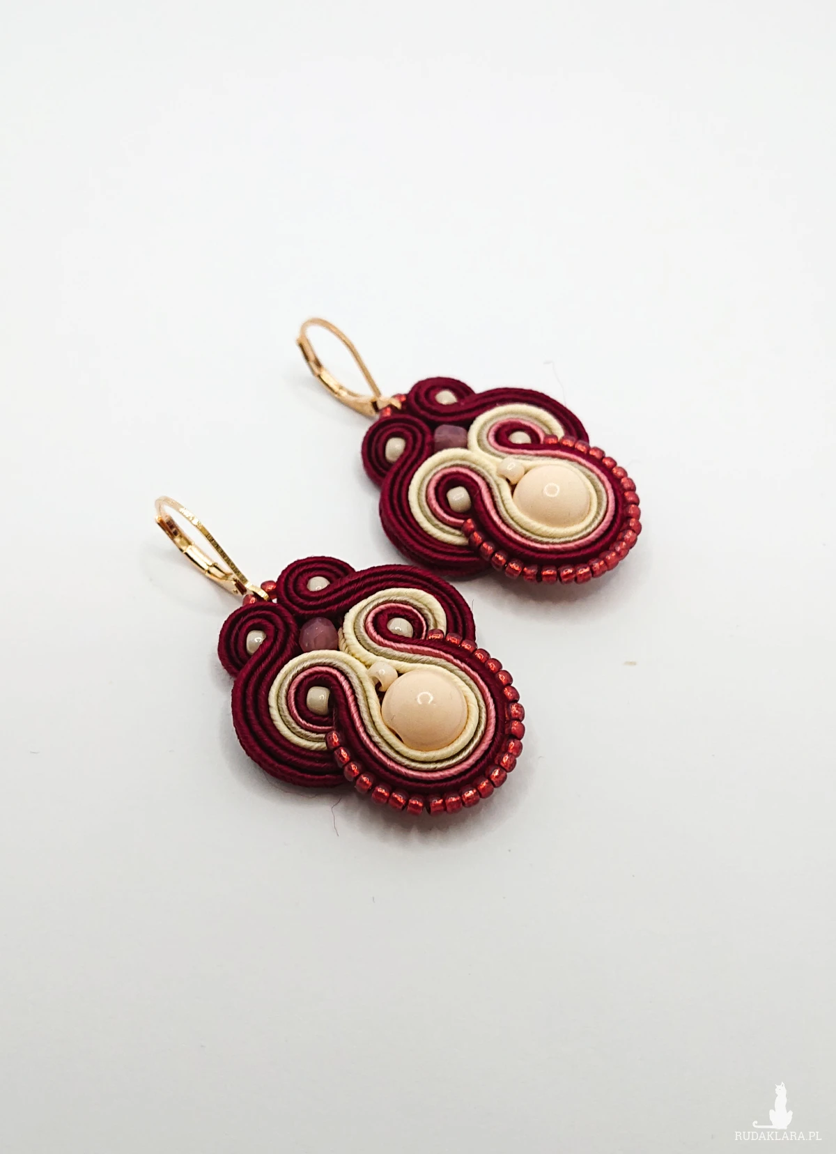 Kremowe szklane koraliki otoczone sznurkami sutasz w odcieniach kremowym, beżowymi, różowym oraz bordowym oraz niewielkimi japońskimi szklanymi koralikami. Góra kolczyków w kolorze bordowym z jasnymi koralikami. Kolczyki zawieszone na biglach angielskich w kolorze różowego złota.