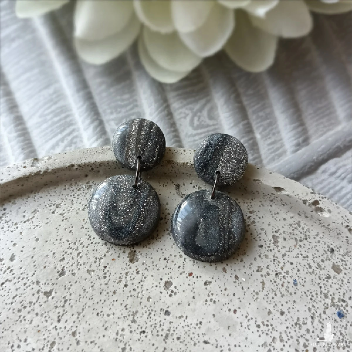 Kolczyki zostały wykonane w całości ręcznie z wysokiej jakości glinki polimerowej. Jest to materiał bardzo trwały, lekki i odporny na wszelkiego rodzaju czynniki zewnętrzne. Kolczyki są w kolorze szarym z drobinkami brokatu, zawieszone na sztyftach. Zostały pokryte żywicą epoksydową dla nadania błyszczącego efektu.Elementy metalowe są ze stali chirurgicznej. Całkowita długość kolczyków 2,8 cm, szerokość 1,8 cm. Są bardzo lekkie i pasują do każdej stylizacji na każdą porę dnia. Biżuteria pakowana jest w ozdobne pudełko. W innej ofercie dostępna jest zawieszka do kompletu.