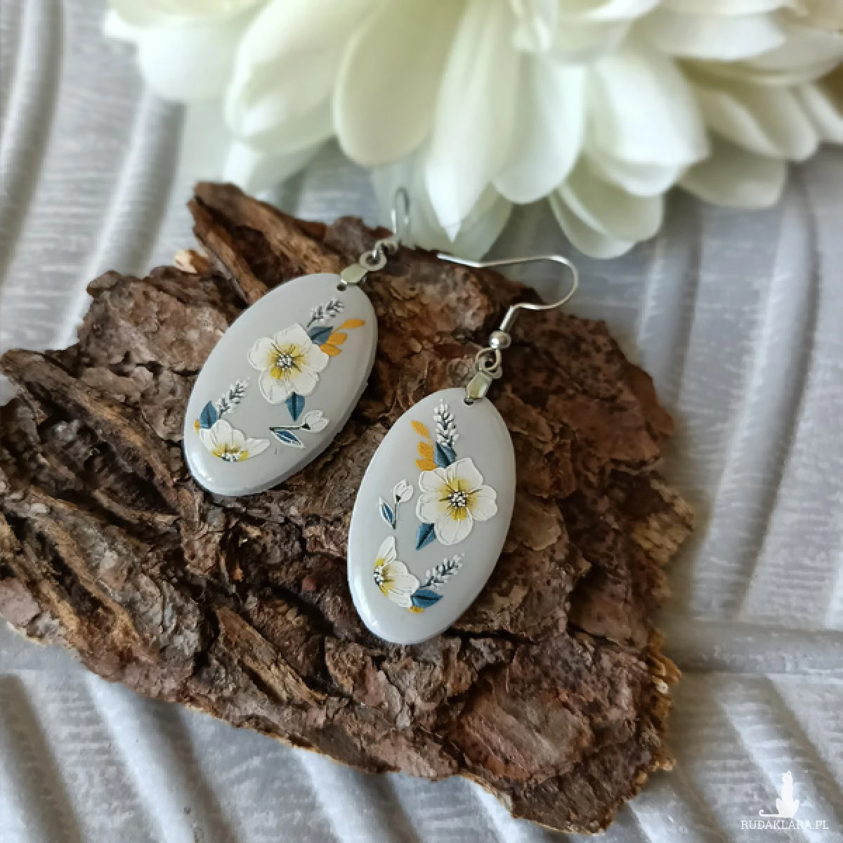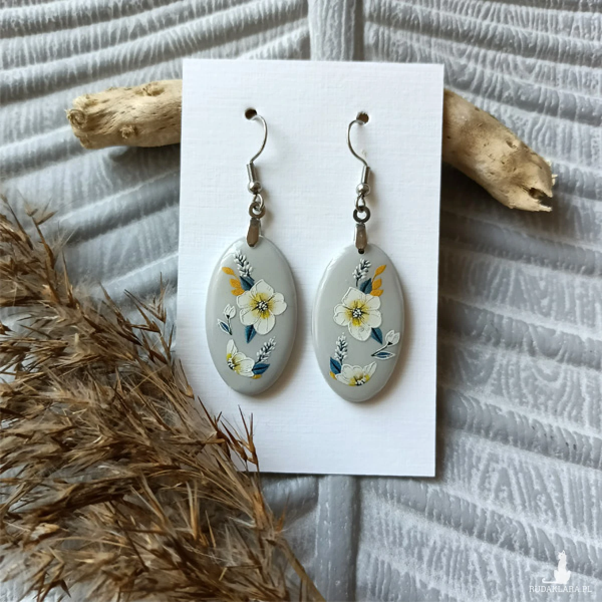 Kolczyki zostały wykonane w całości ręcznie z wysokiej jakości glinki polimerowej. Jest to materiał bardzo trwały, lekki i odporny na wszelkiego rodzaju czynniki zewnętrzne. Kolczyki są w kolorze szarym z delikatnym ornamentem, pokryte żywicą epoksydową dla nadania błyszczącego efektu. Elementy metalowe są ze stali chirurgicznej w kolorze srebrnym. Całkowita długość kolczyków 5,5 cm, szerokość 2 cm. Są bardzo lekkie i pasują do każdej stylizacji na każdą porę dnia. Biżuteria pakowana jest w ozdobne pudełko.