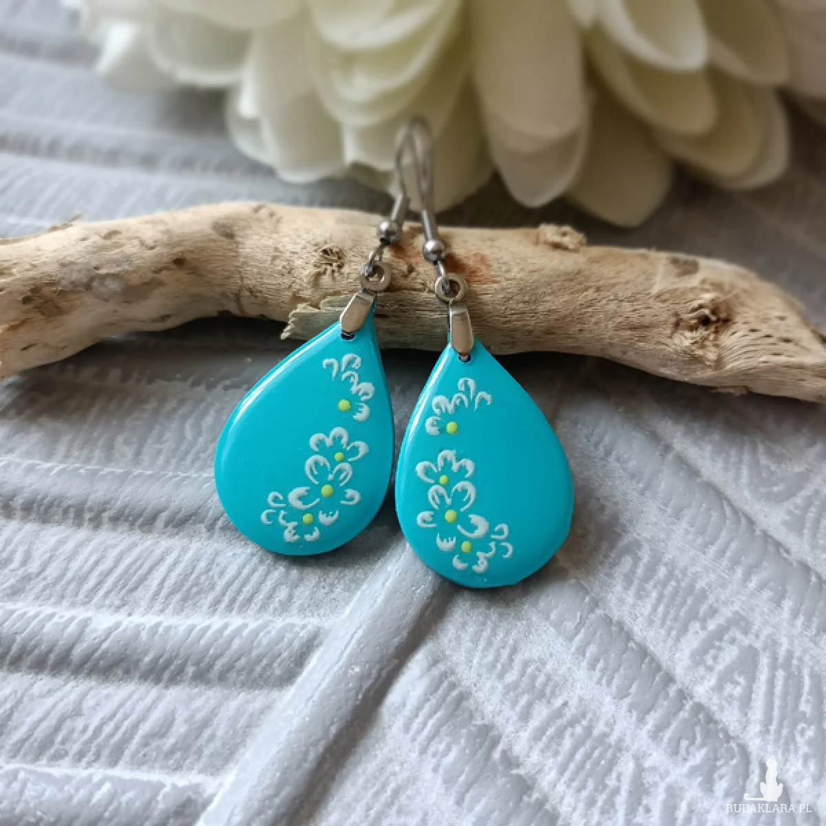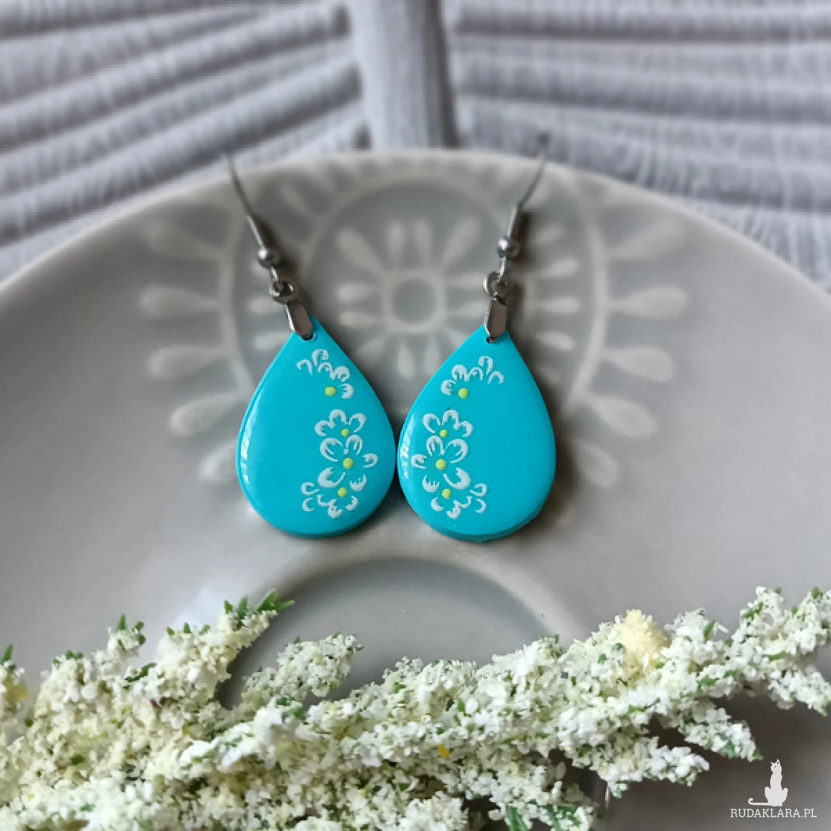 Kolczyki zostały wykonane w całości ręcznie z wysokiej jakości glinki polimerowej. Jest to materiał bardzo trwały, lekki i odporny na wszelkiego rodzaju czynniki zewnętrzne. Kolczyki są w kolorze turkusowym z delikatnym kwiatowym ornamentem. Kolczyki pokryte są żywicą epoksydową. Elementy metalowe są ze stali chirurgicznej. Całkowita długość kolczyków 5 cm, szerokość 2 cm. Są bardzo lekkie i pasują do każdej stylizacji na każdą porę dnia. Biżuteria pakowana jest w ozdobne pudełko.