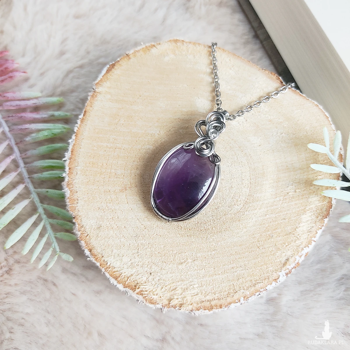 Naszyjnik Ametyst ręcznie robiony. Wykonany techniką wire wrapping z drutów ze stali chirurgicznej.